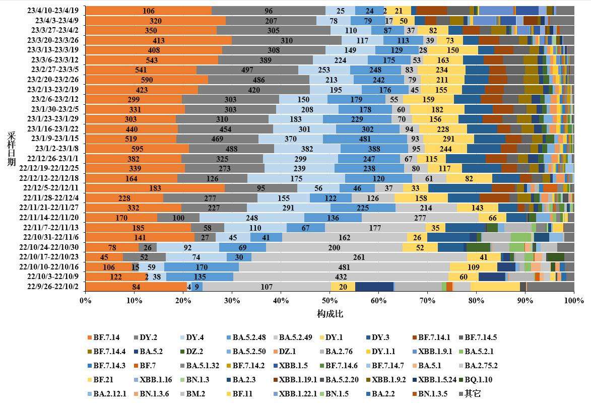 2022年12月1日至2023年4月20日,全国共报送32993例本土病例新冠病毒基因组有效序列,均为奥密克戎变异株,涵盖117个进化分支。主要流行株为BA.5.2及其亚分支(构成比64.3%)和BF.7及其亚分支(构成比33.0%)等。
