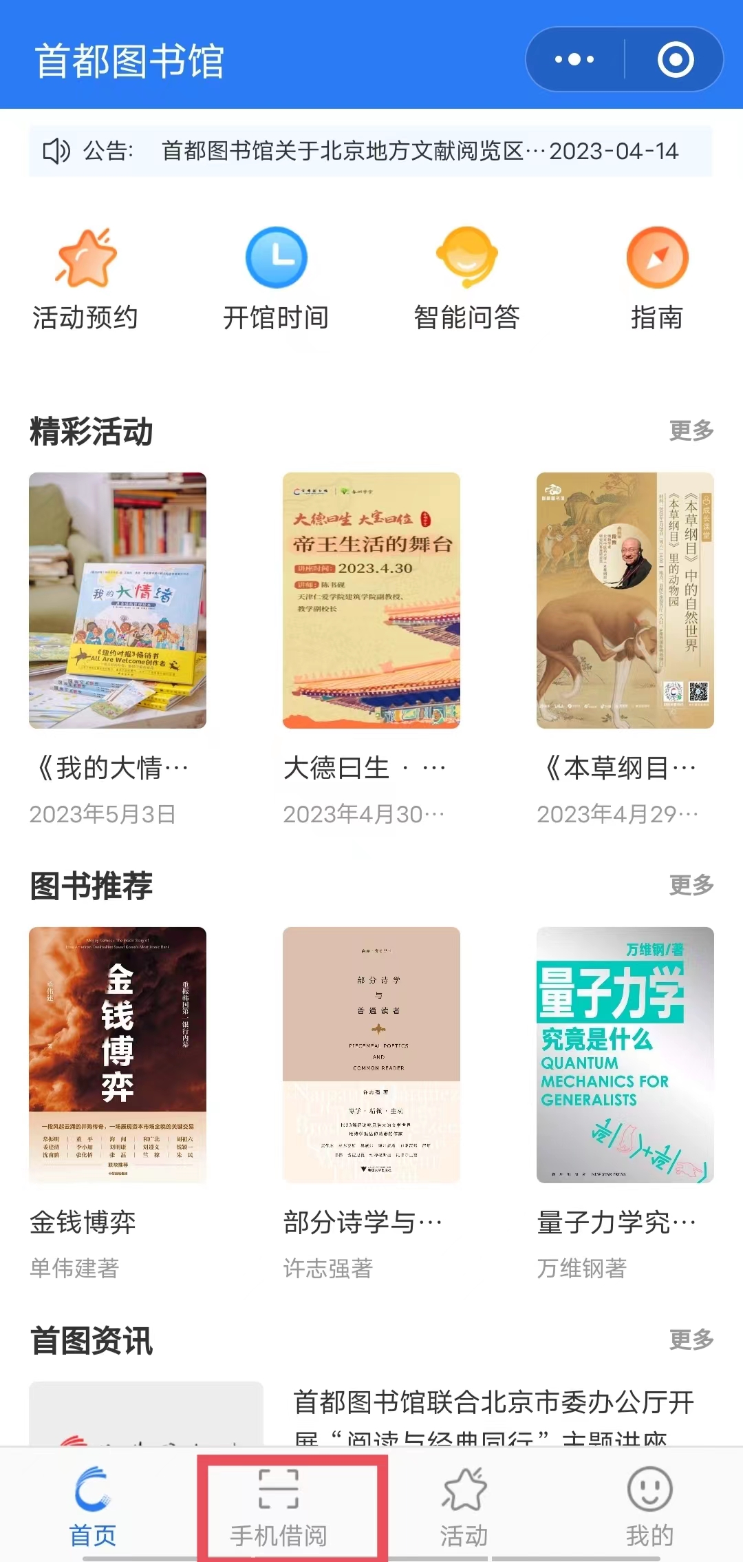 手机借阅服务面向所有持“一卡通”B级以上和少儿“一卡通”A级以上读者证的读者,涵盖首都图书馆开架借阅的100万册中外文图书及少儿中文图书。读者通过首都图书馆微信小程序绑定读者卡后,点击“手机借阅”就可用手机扫描图书上的“首都图书馆藏”条形码借阅图书。一键扫码借书,实现了“你的手机,你的借书机”,免排队省时间。
