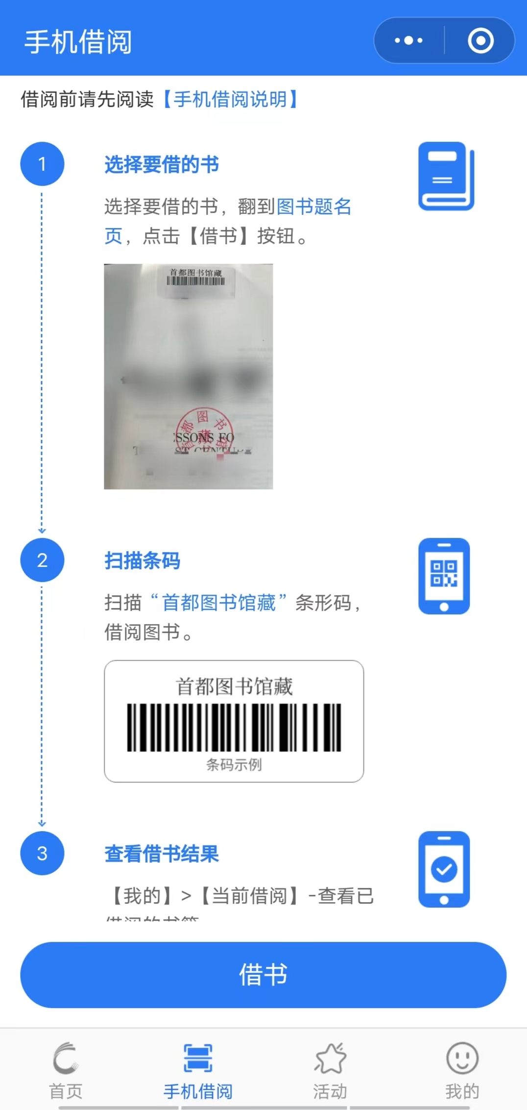 读者通过首都图书馆微信小程序绑定读者卡后,点击“手机借阅”就可用手机扫描图书上的“首都图书馆藏”条形码借阅图书。首都图书馆供图