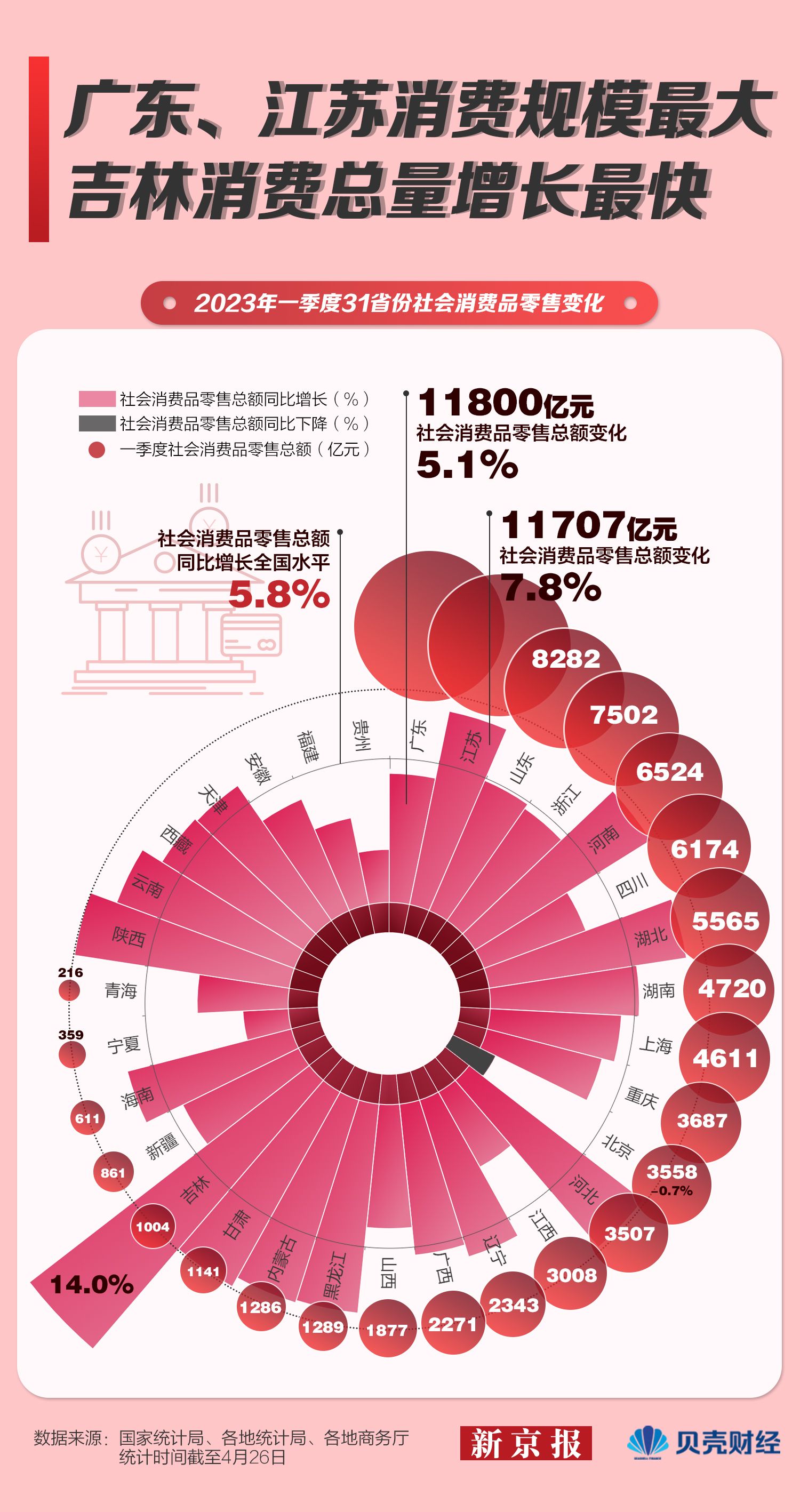 广东、江苏消费规模最大,吉林消费总量增长最快