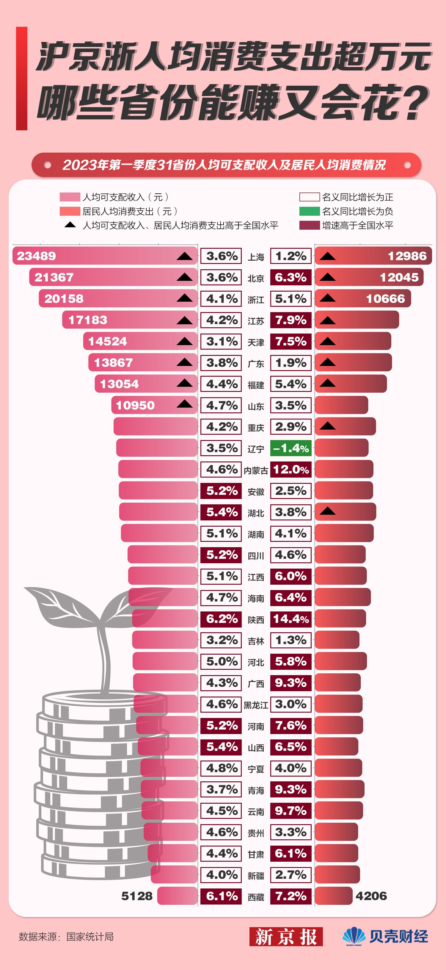 最会花钱的地方也是最能挣钱的地方,一季度31省份人均可支配收入排名中,沪、京、浙再次霸榜前三。今年,浙江人均可支配收入同比增长4.1%,突破2万元关口,增至20158元。