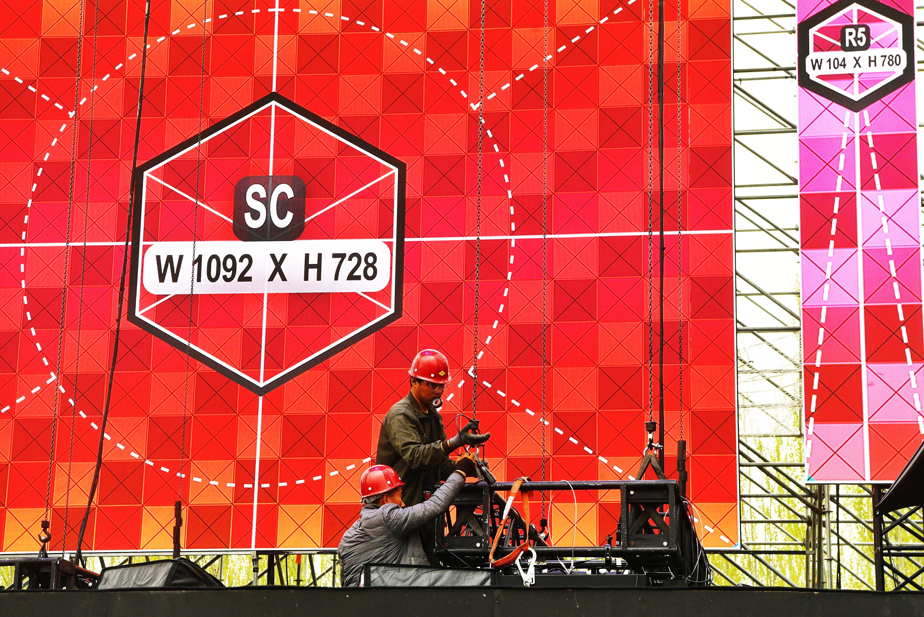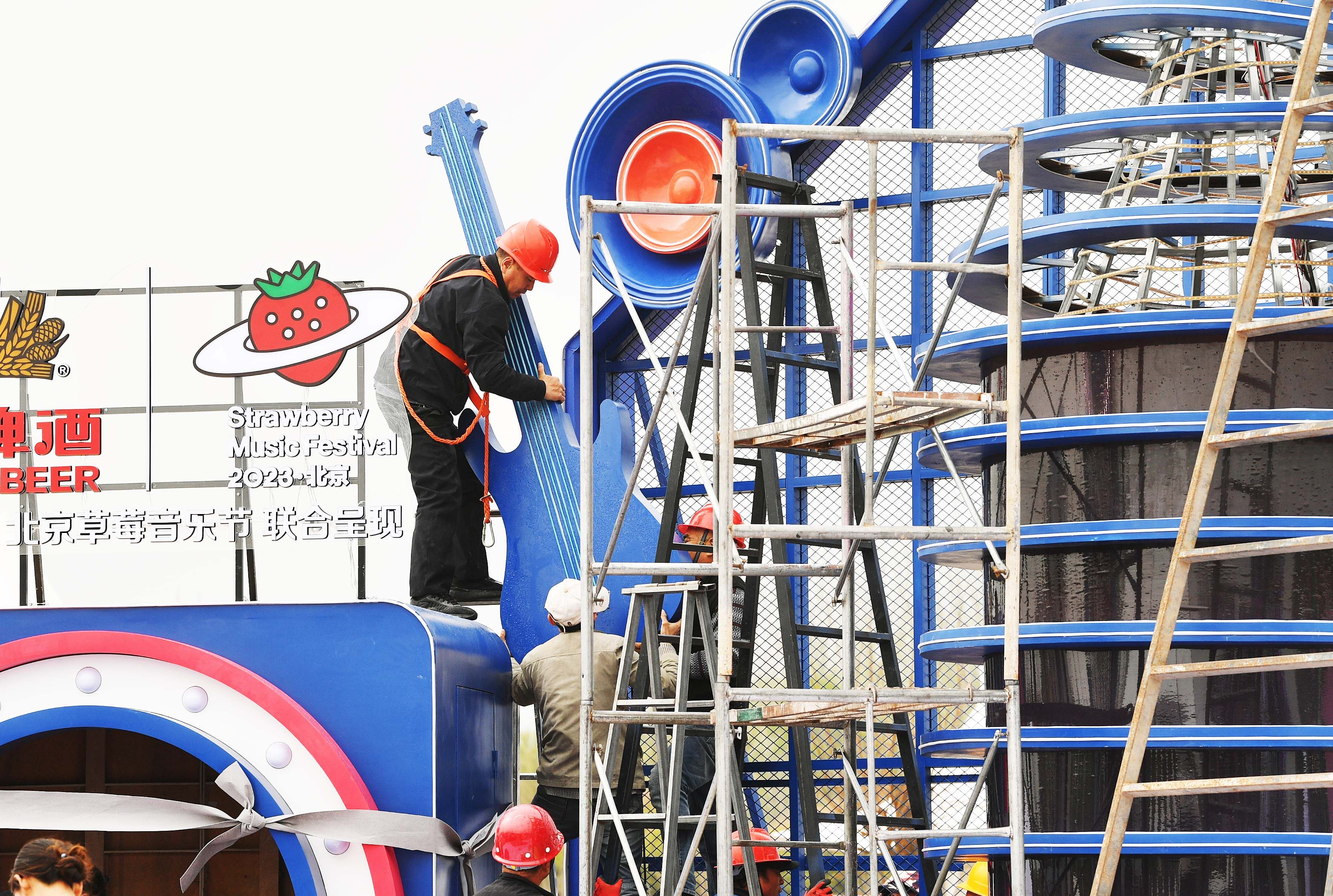 北京草莓音乐节现场,工人师傅正在安装调试舞台设备。新京报记者 陶冉 摄