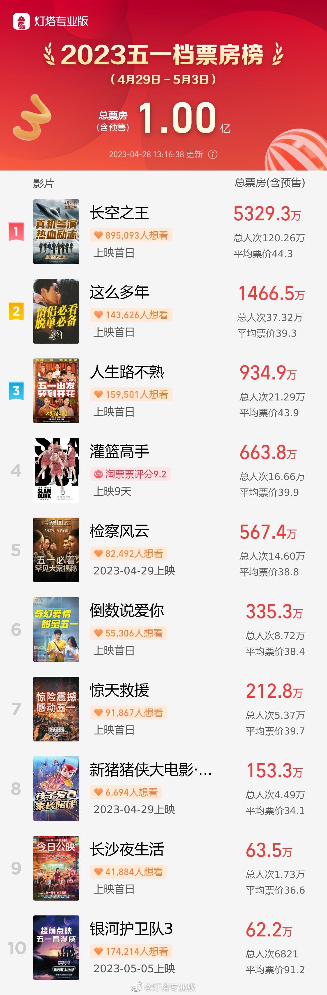 新京报讯 据灯塔专业版实时数据,截至4月28日13时16分,2023年五一档(4月29日至5月3日)档期预售总票房突破1亿,《长空之王》《这么多年》《人生路不熟》位列票房榜前三。