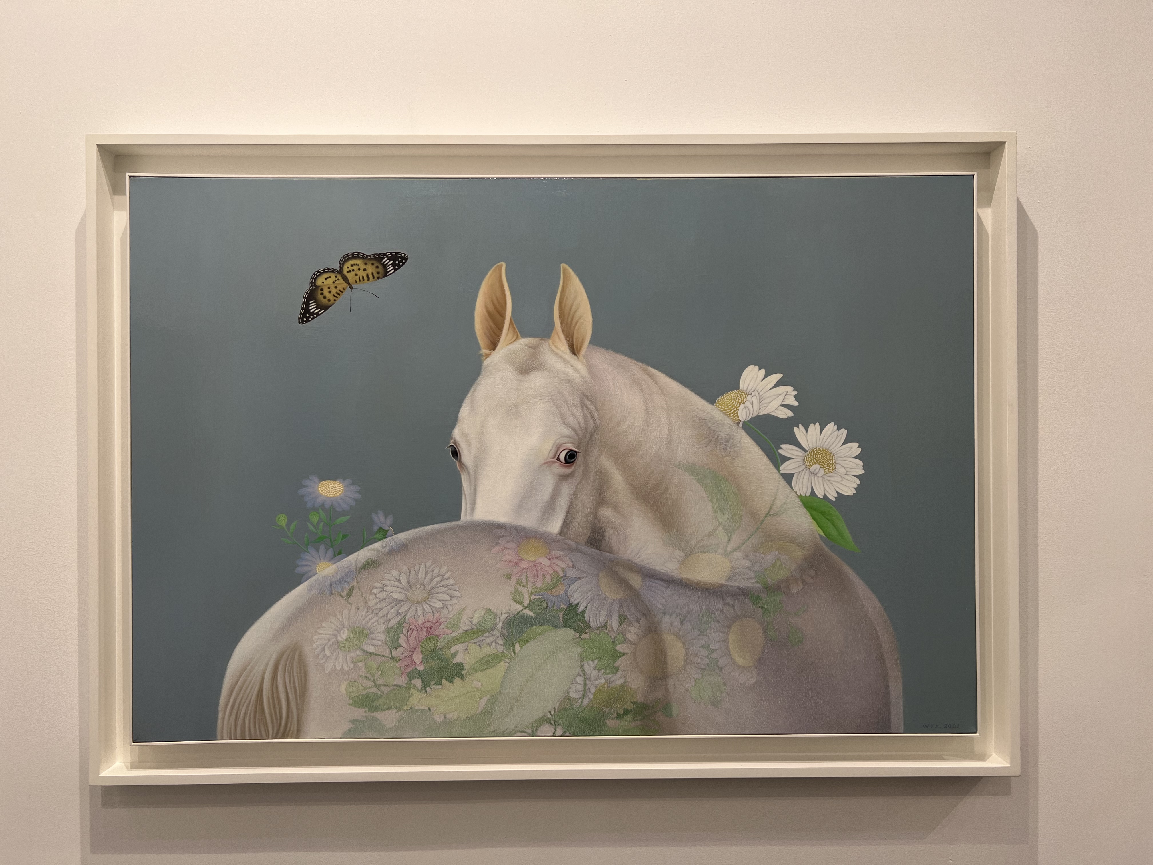 魏阳阳运用了超现实主义的创作方法,实现对时空中间表现对象的挪移、置换和并置。作品不仅在题材上形成了和传统山水画的反差,更在创作概念上构建出了一个全新的世界观。这种游离于现实的不确定性和幻想因素,与当代人内心渴望的审美意向相呼应。同时艺术家痴迷于宋元时期的艺术,在其影响下,她把中国色中特有的青绿、黛色、藕色、靛蓝、妃色等古雅气质的颜色一层层地罩染于油画当中。