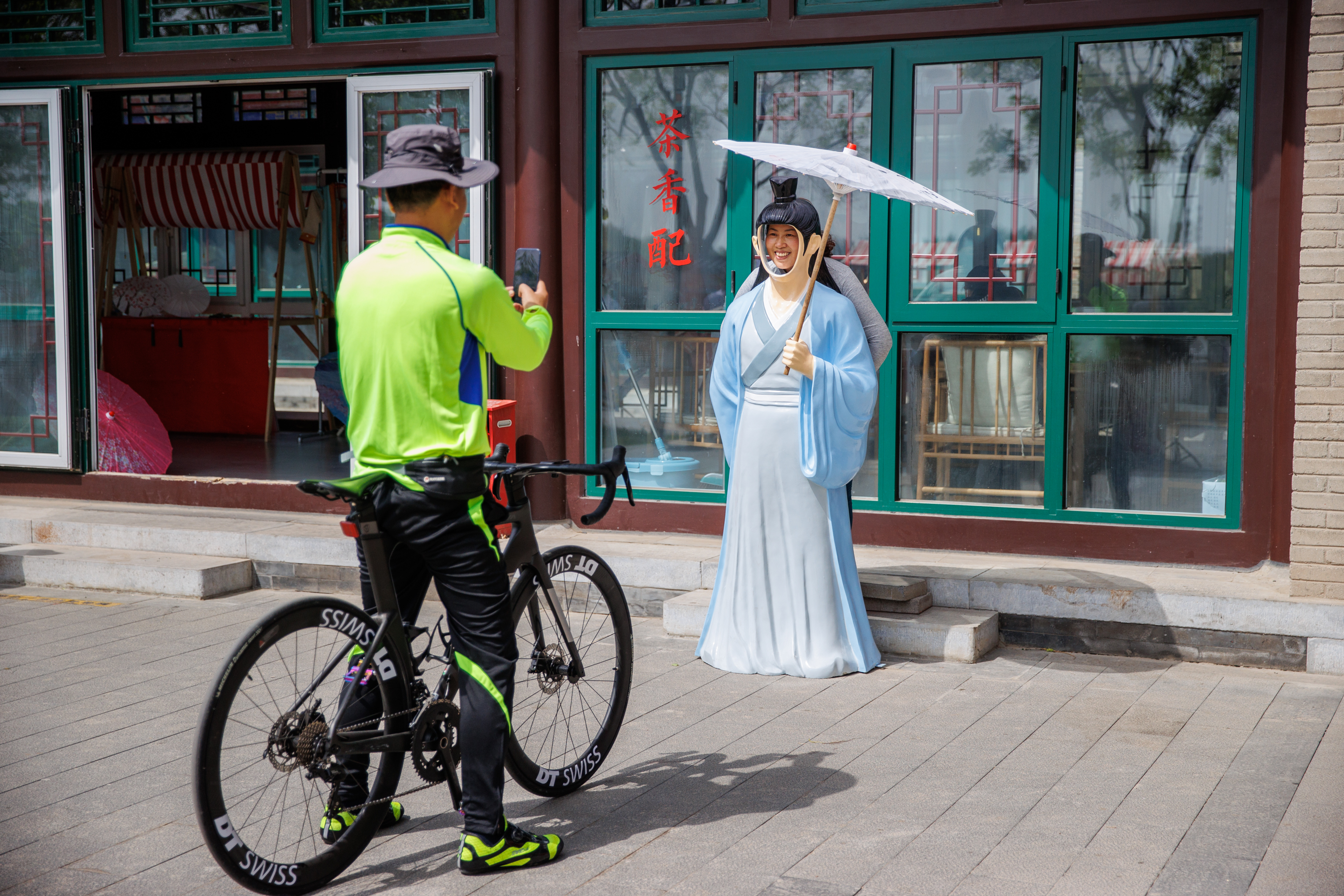 漕运码头,骑行爱好者在拍照。目前许多景点设有骑行绿道,游客骑自行车享受随走、随停、随玩。