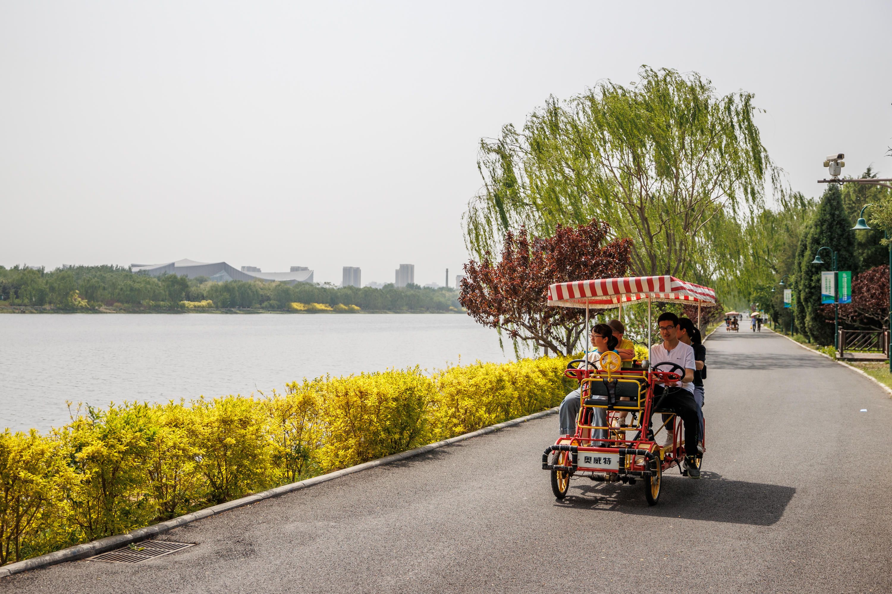 大运河森林公园,游客骑行双排脚踏车边走边赏美景。