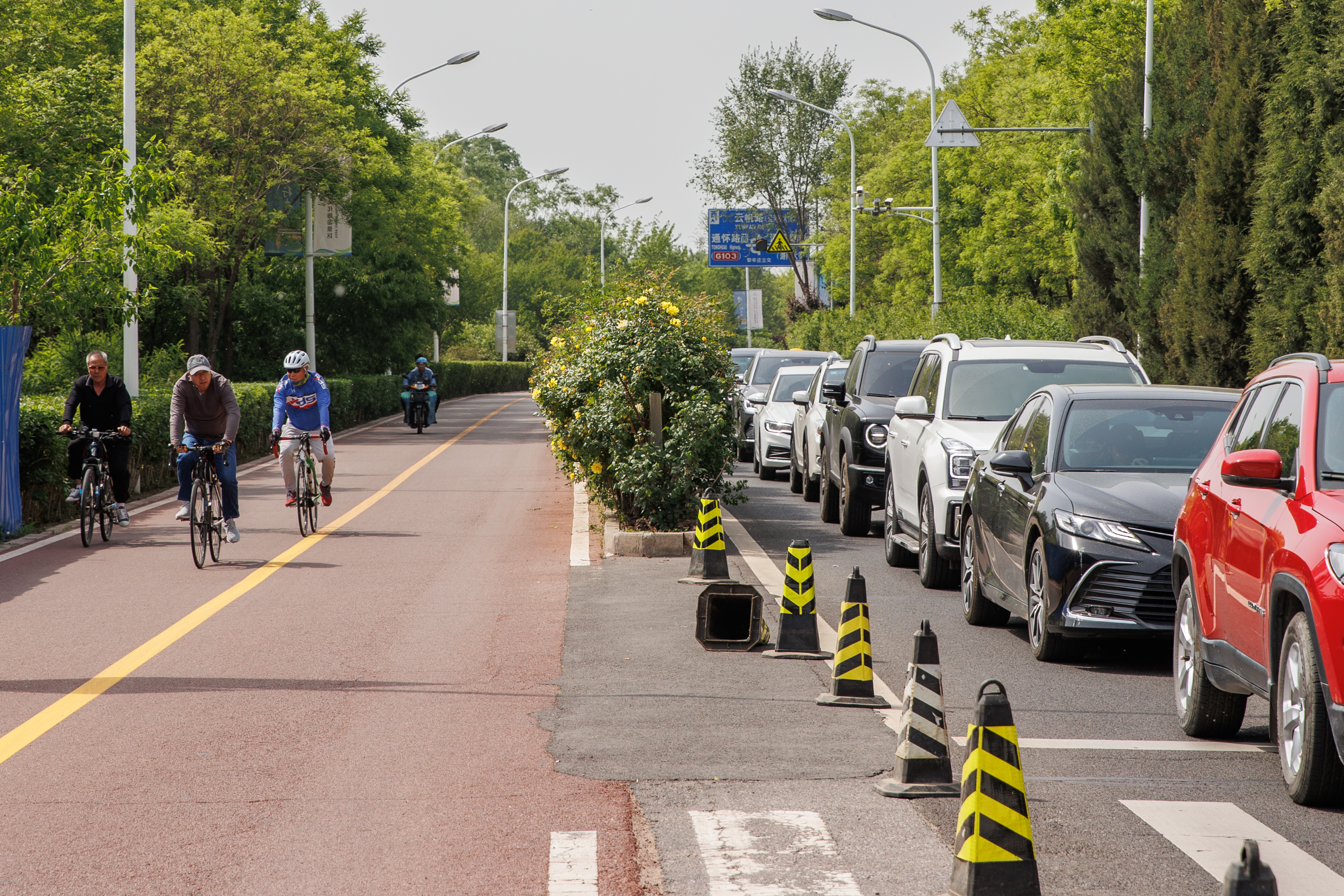 云帆路,小客车排队缓行,自行车一路畅通。