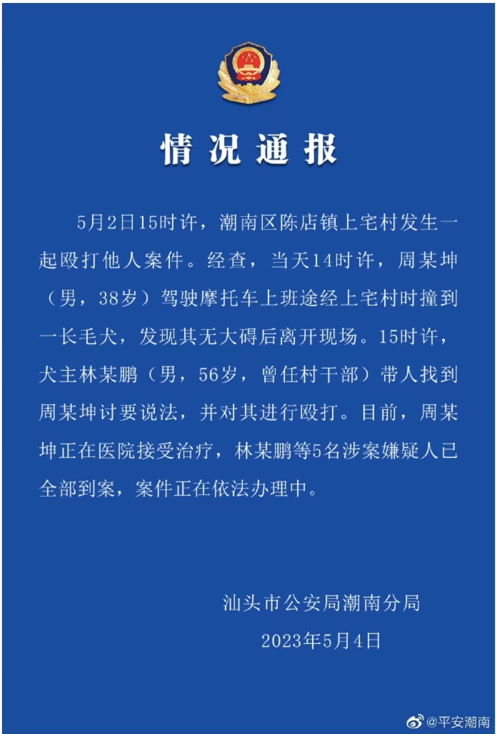5月4日晚,广东省汕头市公安局潮南分局发布通报称,5月2日,周某坤驾驶摩托车上班时撞到一长毛犬,发现其无大碍后离开现场。当天,曾任村干部的犬主林某鹏带人找到周某坤讨要说法,并对其进行殴打。目前,周某坤正在医院接受治疗,林某鹏等5名涉案嫌疑人已全部到案,案件正在依法办理中。