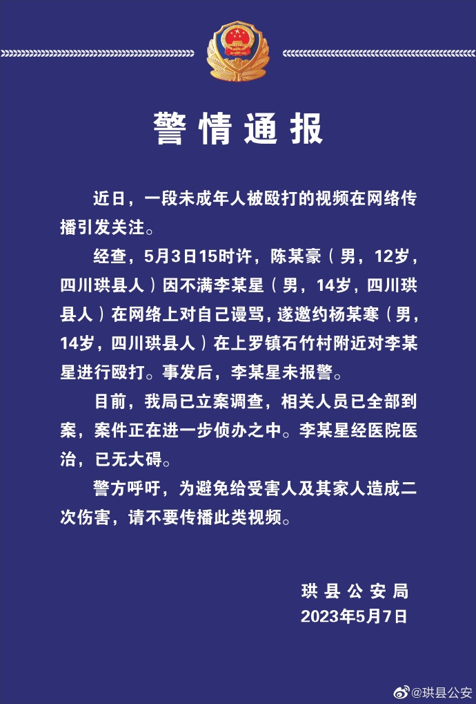 四川警方通报未成年人被殴打视频:已立案调查,相关人员全部到案