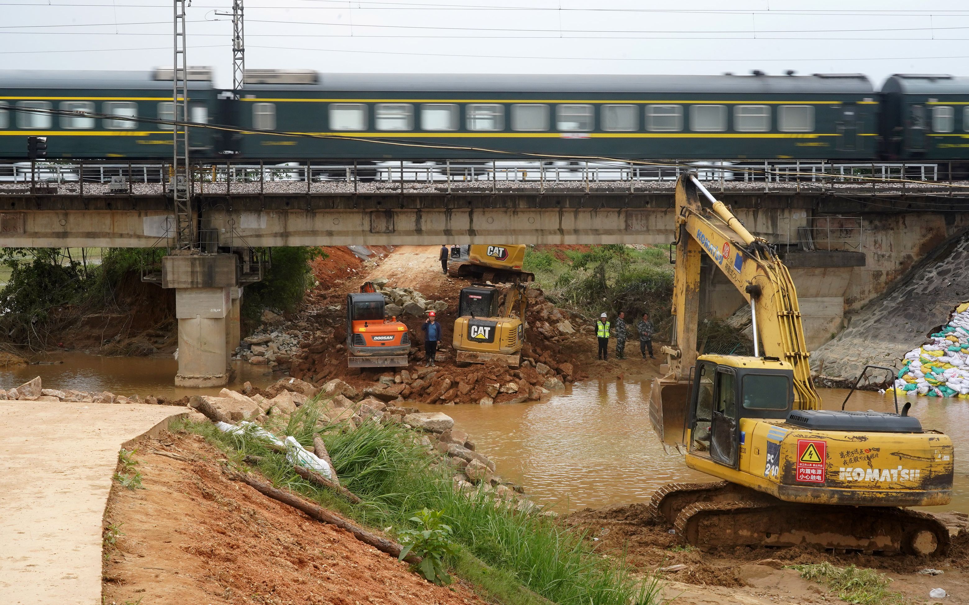 5月7日,江西丰城京九线铁路桥下河堤溃口顺利合龙。图/新华社