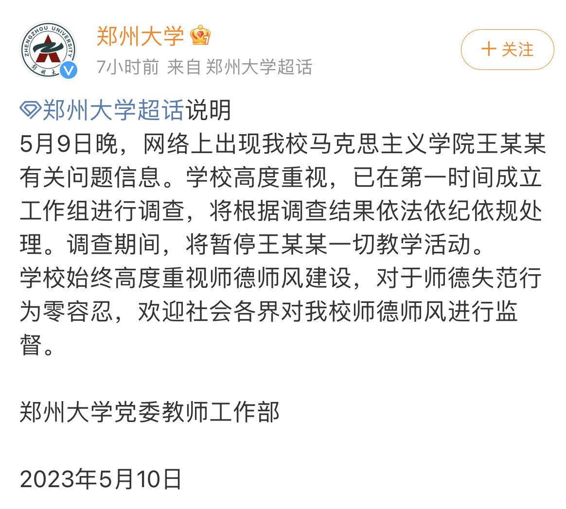 新京报讯 近日,有网友爆料称自己在11年前遭郑州大学一老师侵犯怀孕后被其带去医院打胎。针对此事,5月10日,郑州大学党委教师工作部发布说明称,5月9日晚,网络上出现该校马克思主义学院王某某有关问题信息。学校高度重视,已在第一时间成立工作组进行调查,将根据调查结果依法依纪依规处理。调查期间,将暂停王某某一切教学活动。