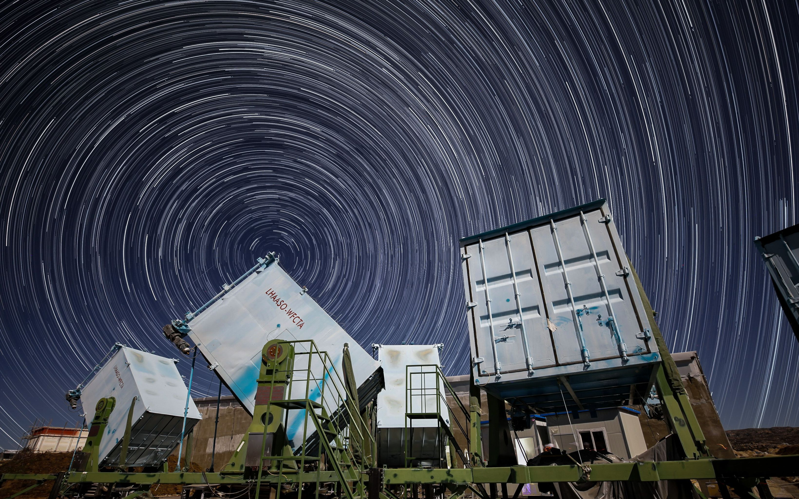广角切伦科夫望远镜阵列犹如拉索的一只只“眼睛”,由18个斜冲向天空的“大蓝箱子”组成,紧盯着宇宙线在大气中闪出的微弱光亮,探测宇宙线中氢、氦、铁等元素的比例。