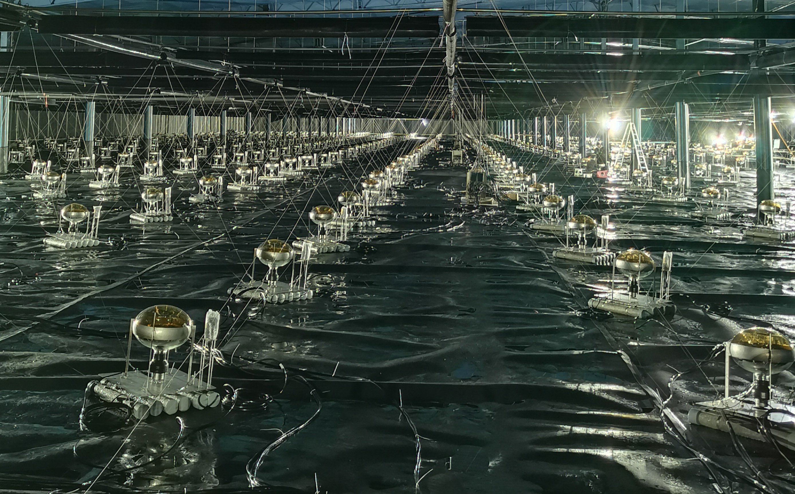 水切伦科夫探测器阵列三号水池内安装完成的光电倍增管。中科院高能所供图