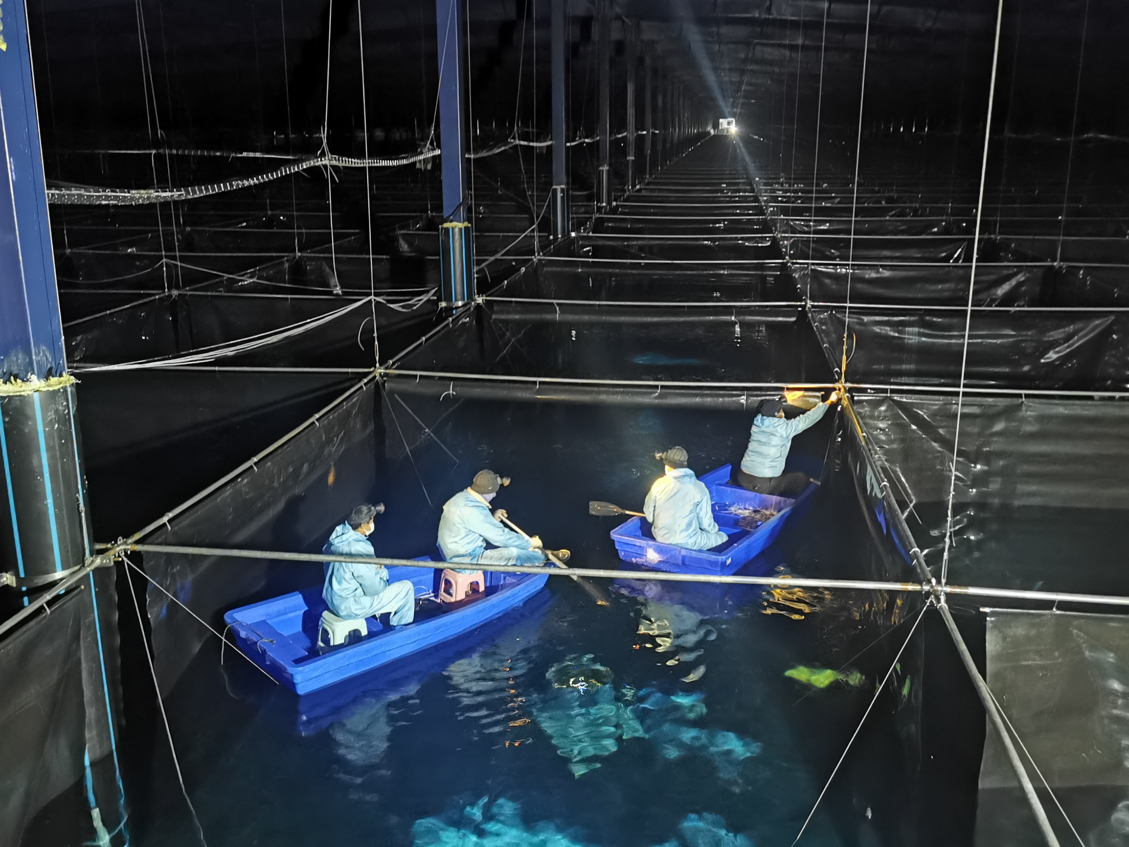 2020年12月11日,水切伦科夫探测器阵列三号水池注水后,工作人员下放隔光帘。中科院高能所供图