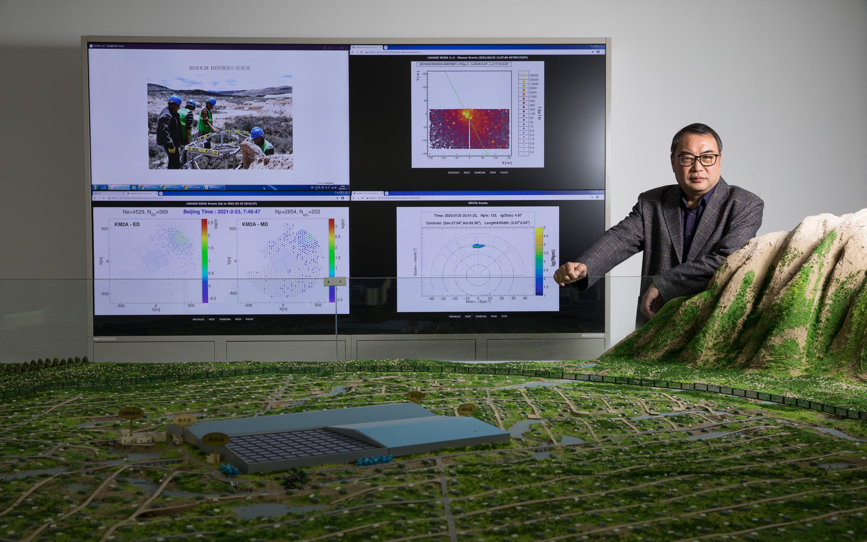 中国科学院高能物理研究所研究员、拉索项目首席科学家曹臻展示拉索沙盘。中科院高能所供图