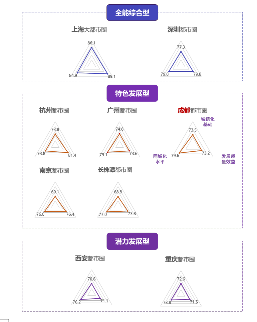在这9个都市圈评价结果中,上海大都市圈和深圳都市圈位列第一梯队,属于全能综合型;杭州、广州、成都、南京和长株潭5个都市圈位列第二梯队,其中,成都都市圈在中西部处于领先地位,且发展特色相对突出,在同城化水平领先,仅次于上海和广州都市圈。而重庆和西安属于潜力发展型都市圈。