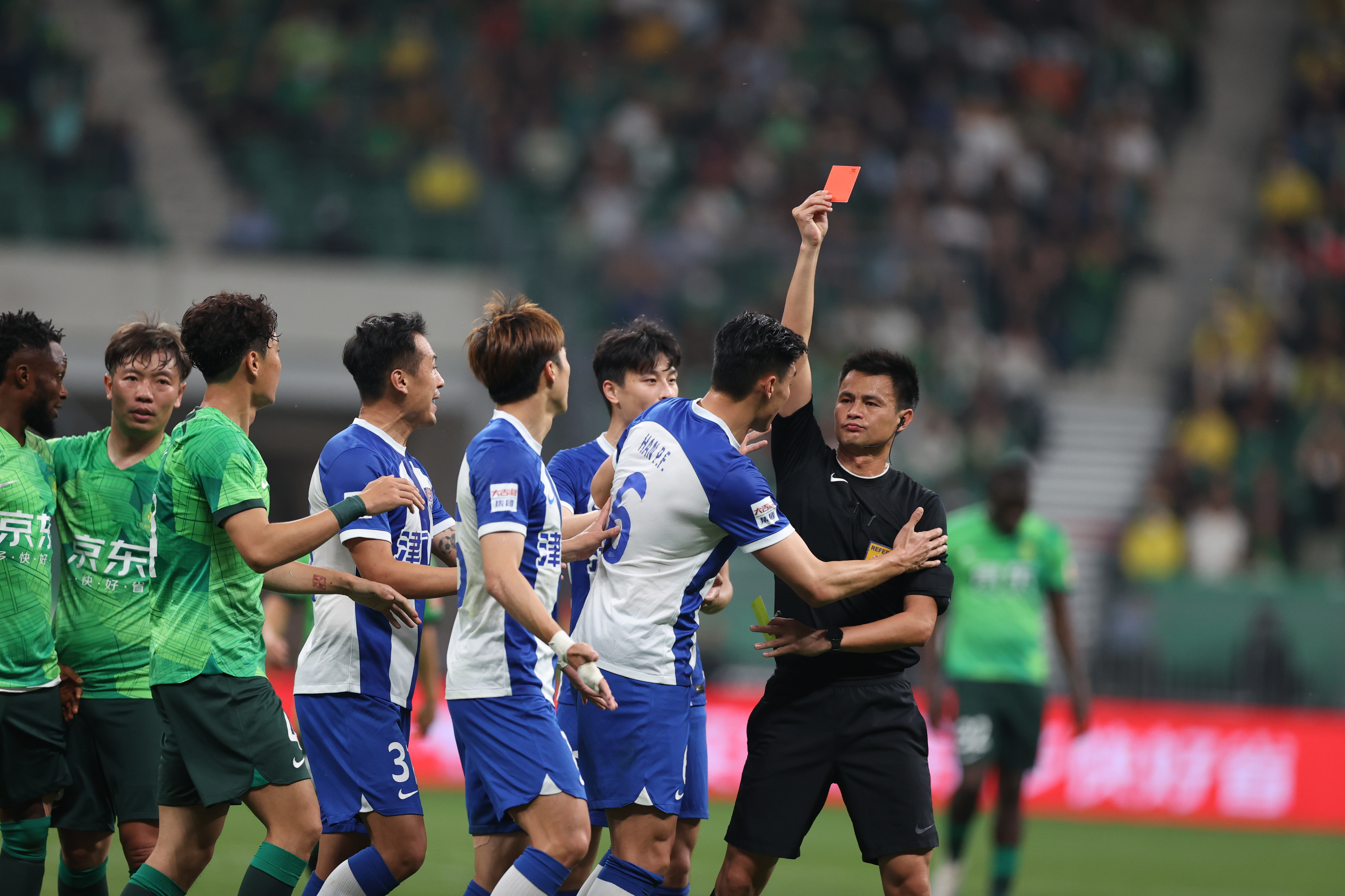 天津津门虎球员在比赛中吃到红牌。 新京报记者 王飞 摄
