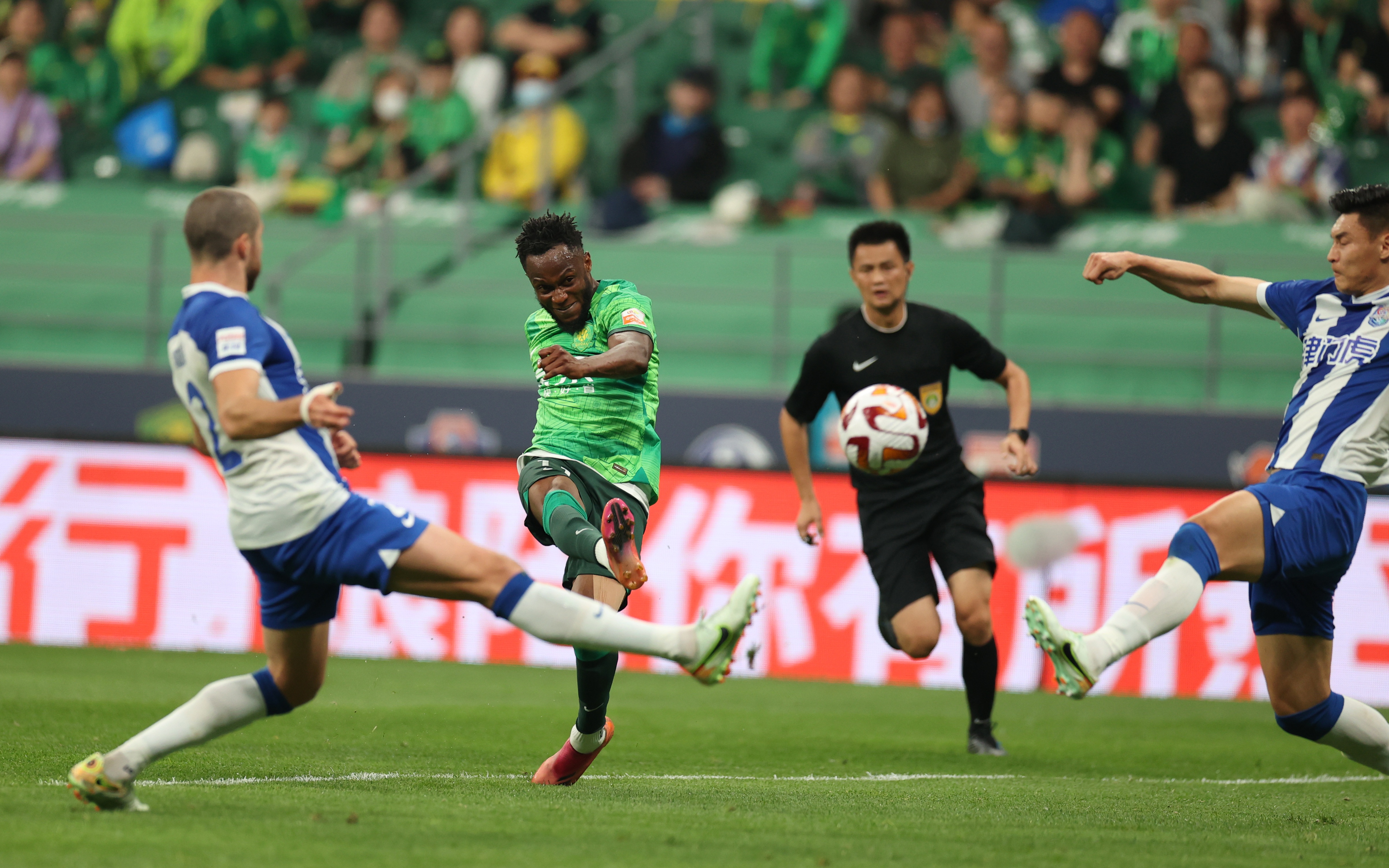 阿德本罗的劲射被对方门将扑出。 新京报记者 王飞 摄