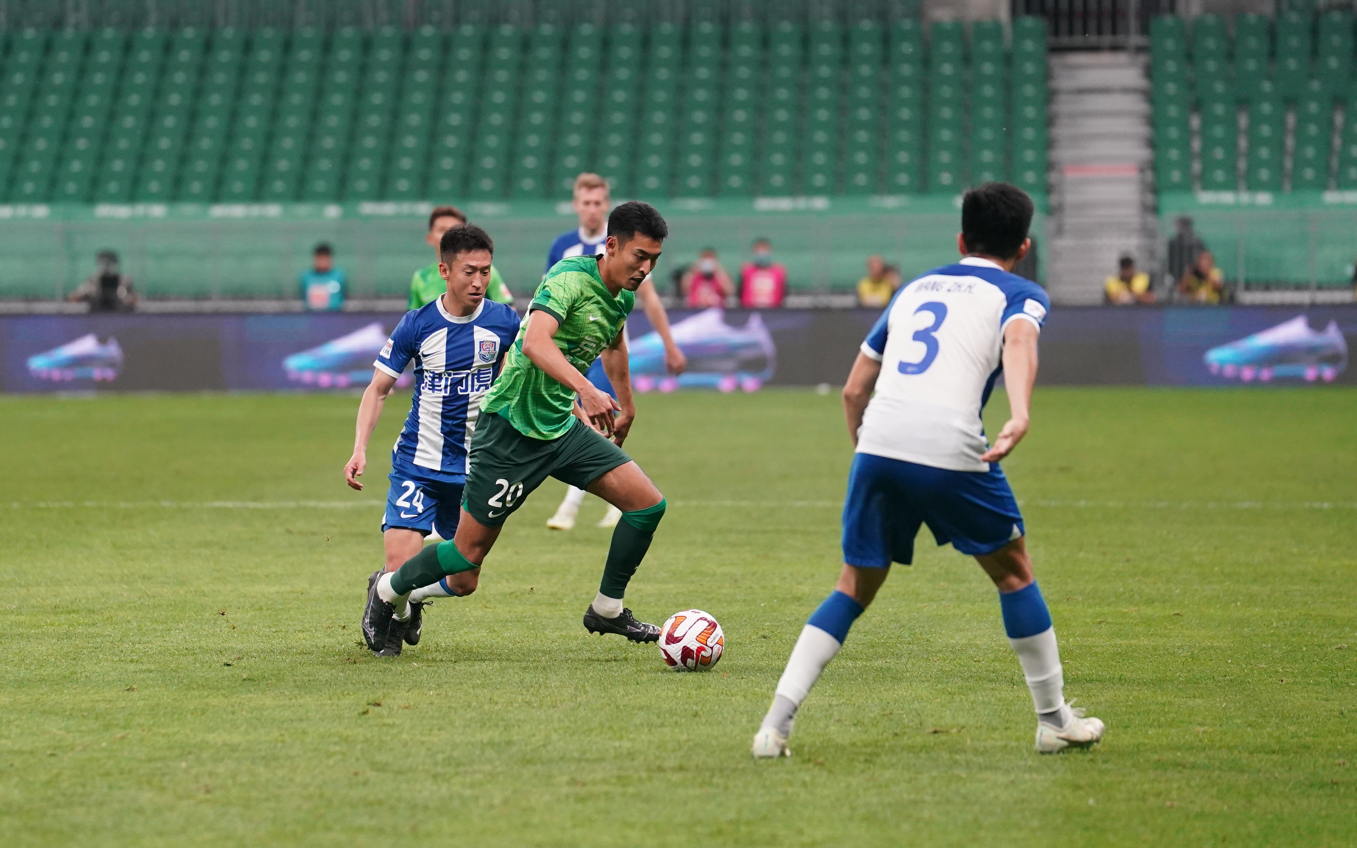 王子铭在比赛中带球,他的进球帮助国安拿到1分。 新京报记者 王飞 摄