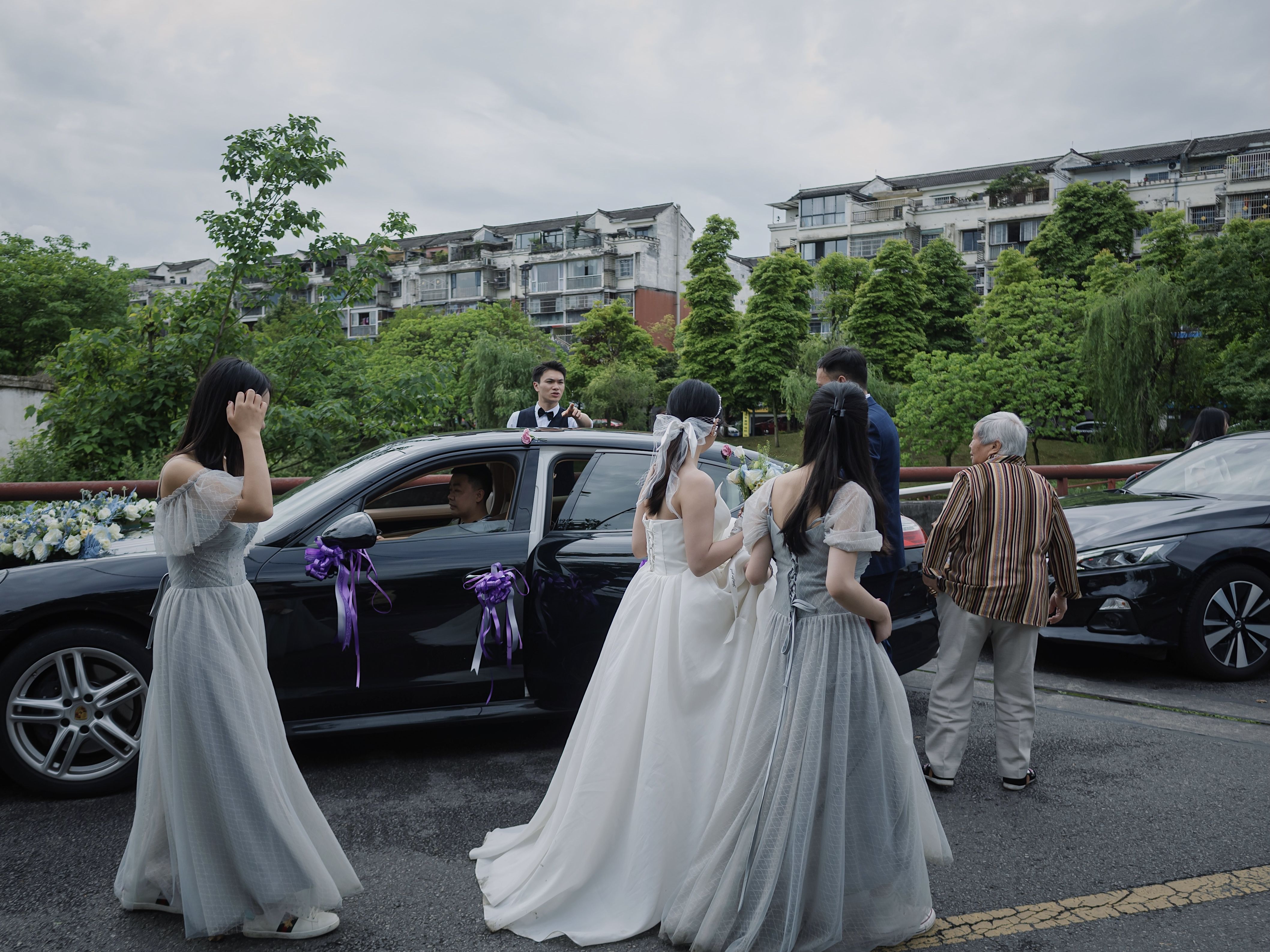 2023年5月7日,都江堰市,穿婚纱的新人。