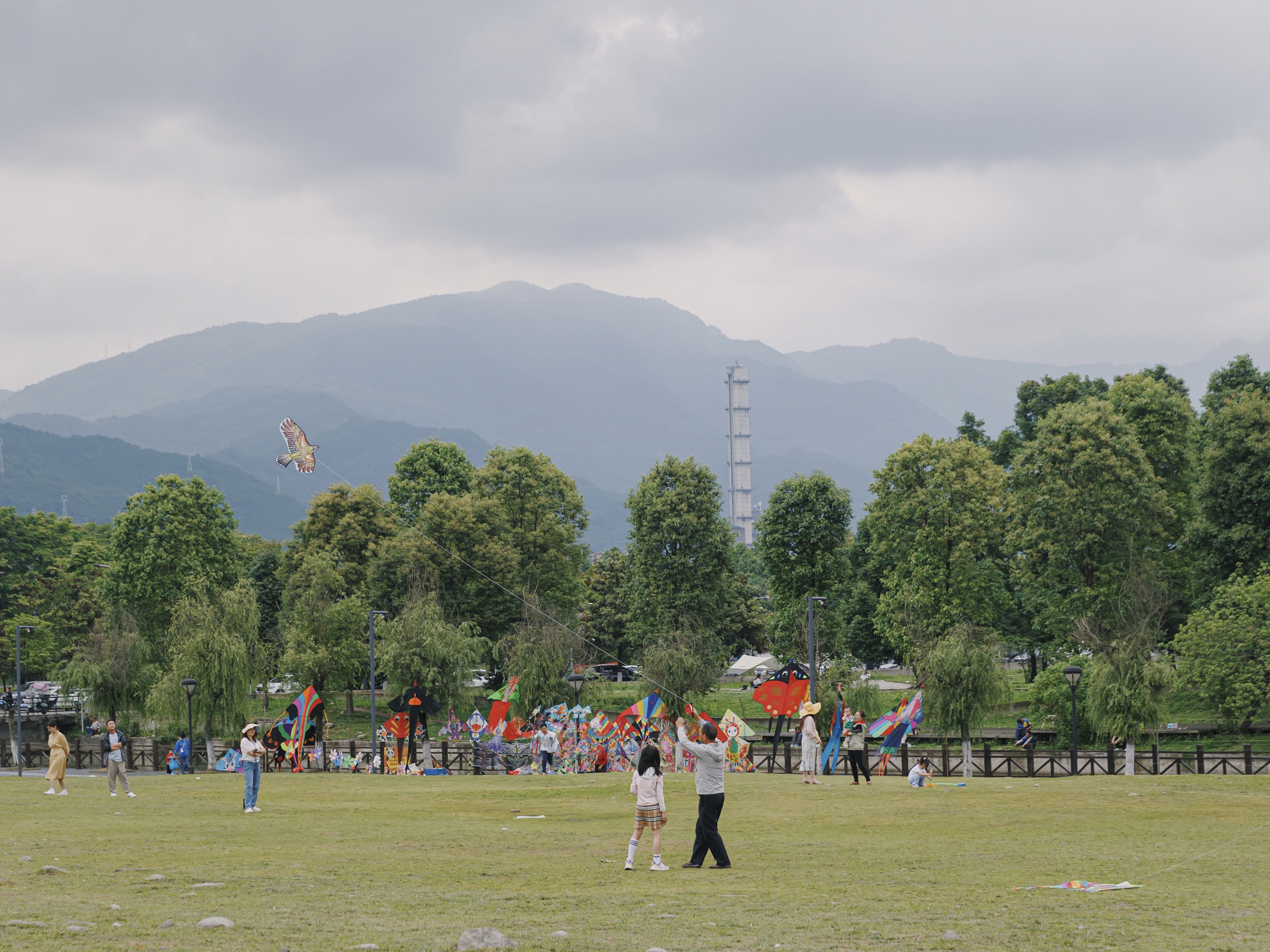 2023年5月7日,都江堰市,人们在草坪上露营、放风筝。