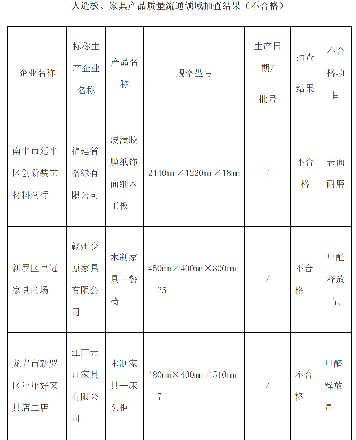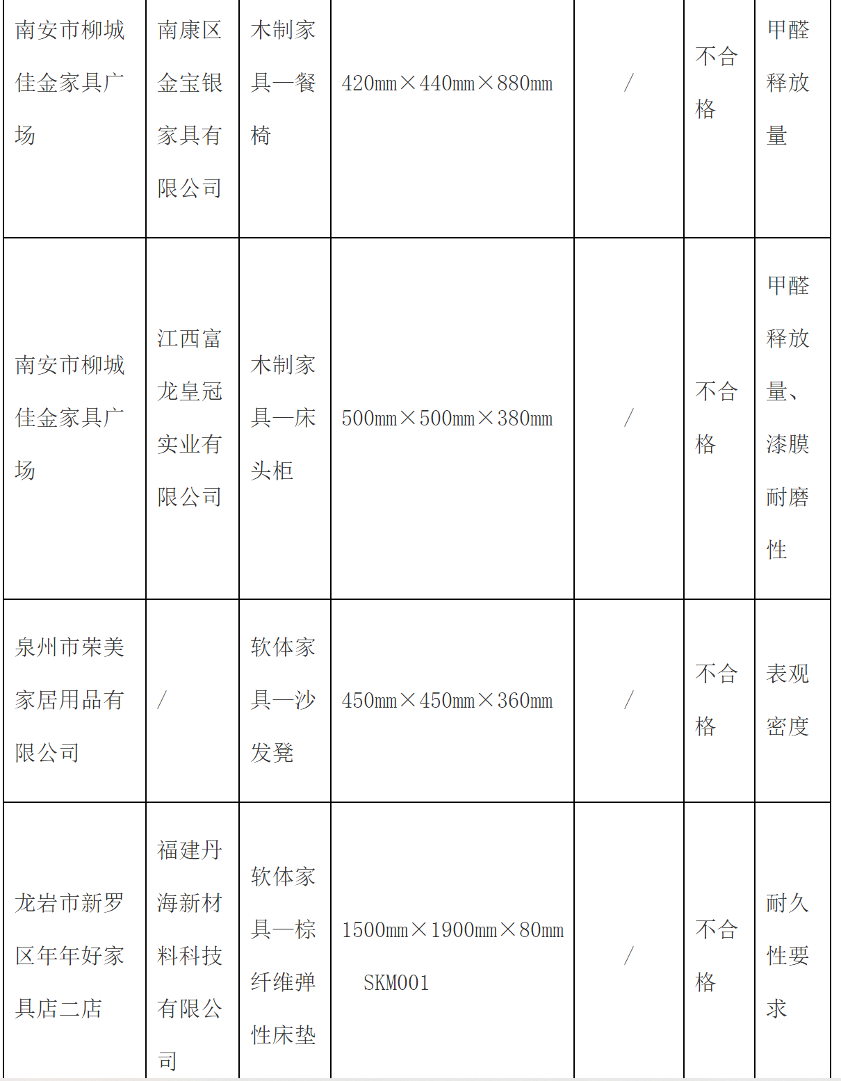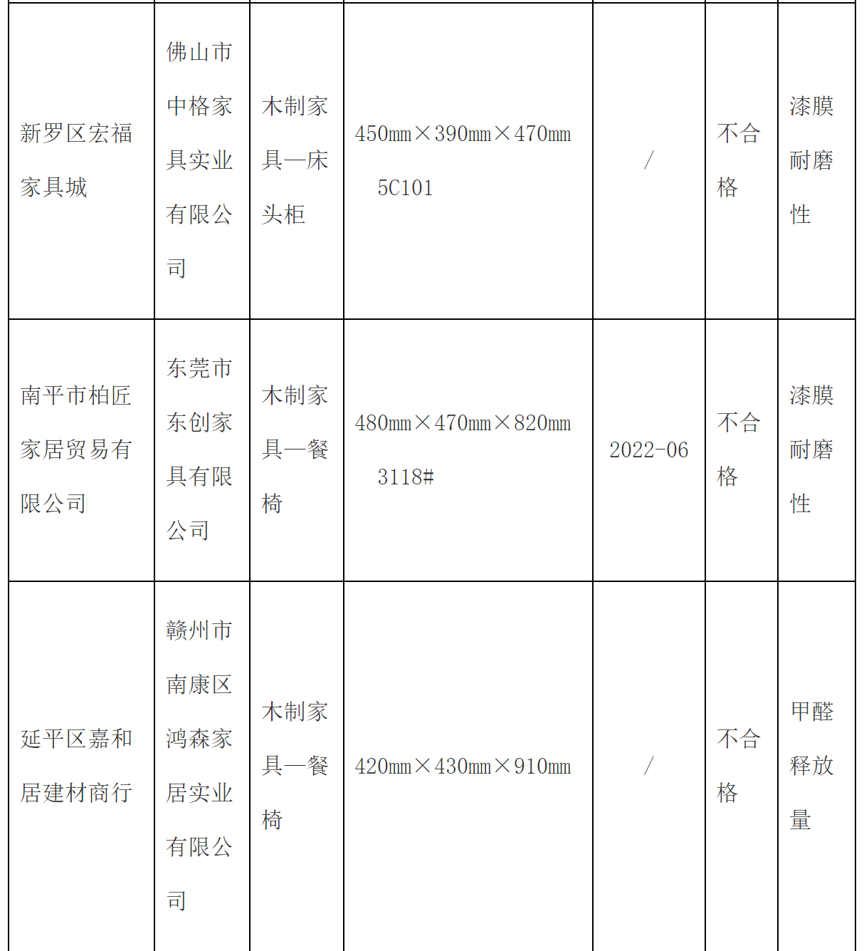 不合格名单显示,标称赣州少原家具有限公司生产的餐椅(规格型号450mm×400mm×800mm 25)不合格;标称江西元月家具有限公司生产的床头柜(规格型号480mm×400mm×510mm 7)不合格;标称赣州市南康区鸿森家居实业有限公司生产的餐椅(规格型号420mm×430mm×910mm)不合格;标称赣州市南康区金宝银家具有限公司生产的餐椅(规格型号420mm×440mm×880mm)不合格;标称江西富龙皇冠实业有限公司生产的床头柜(规格型号500mm×500mm×380mm)不合格等,上述产品均为甲醛释放量不合格。