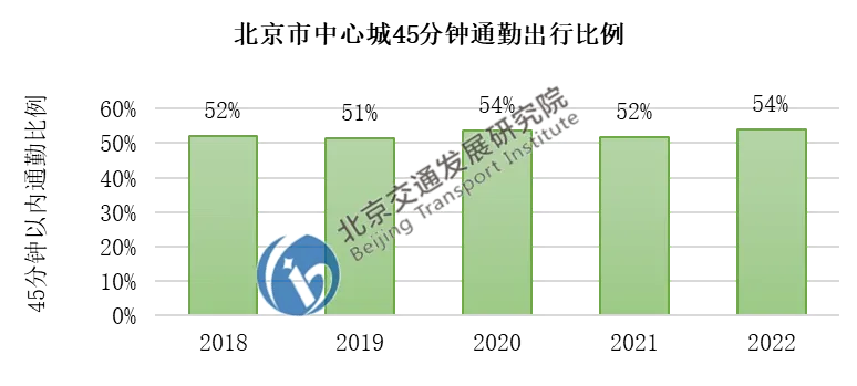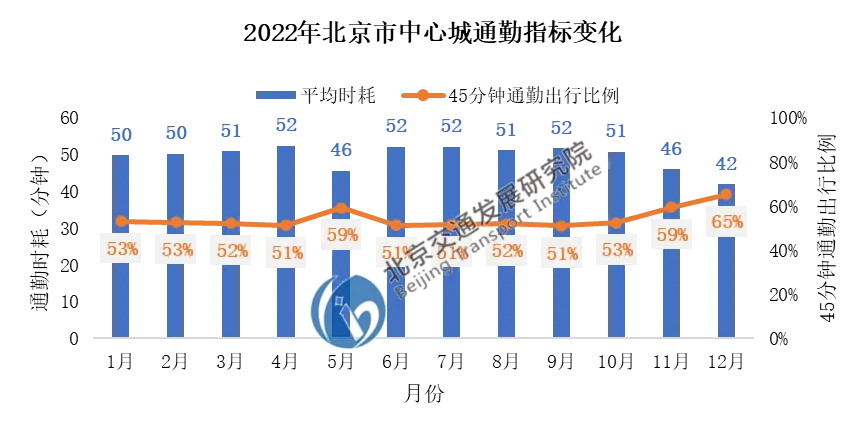 记者注意到,报告首先简述了2022年北京市通勤的总体情况。去年,北京中心城区平均通勤时耗50分钟,平均通勤距离13.2公里,45分钟通勤出行比例为54%,2022年5月、11-12月受疫情影响,出行总量下降,45分钟通勤出行比例超过59%。