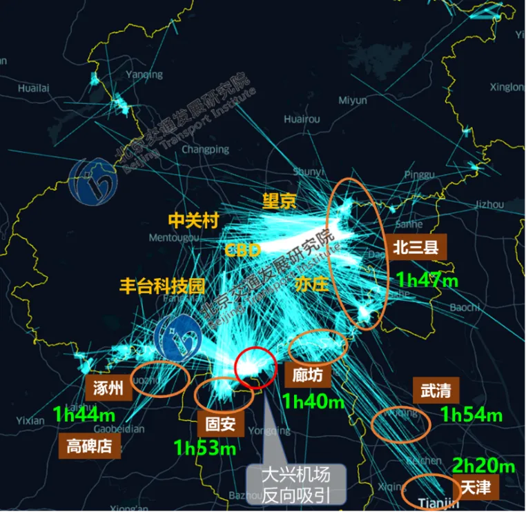 环京地区与北京通勤交换方向。北京交通发展研究院供图