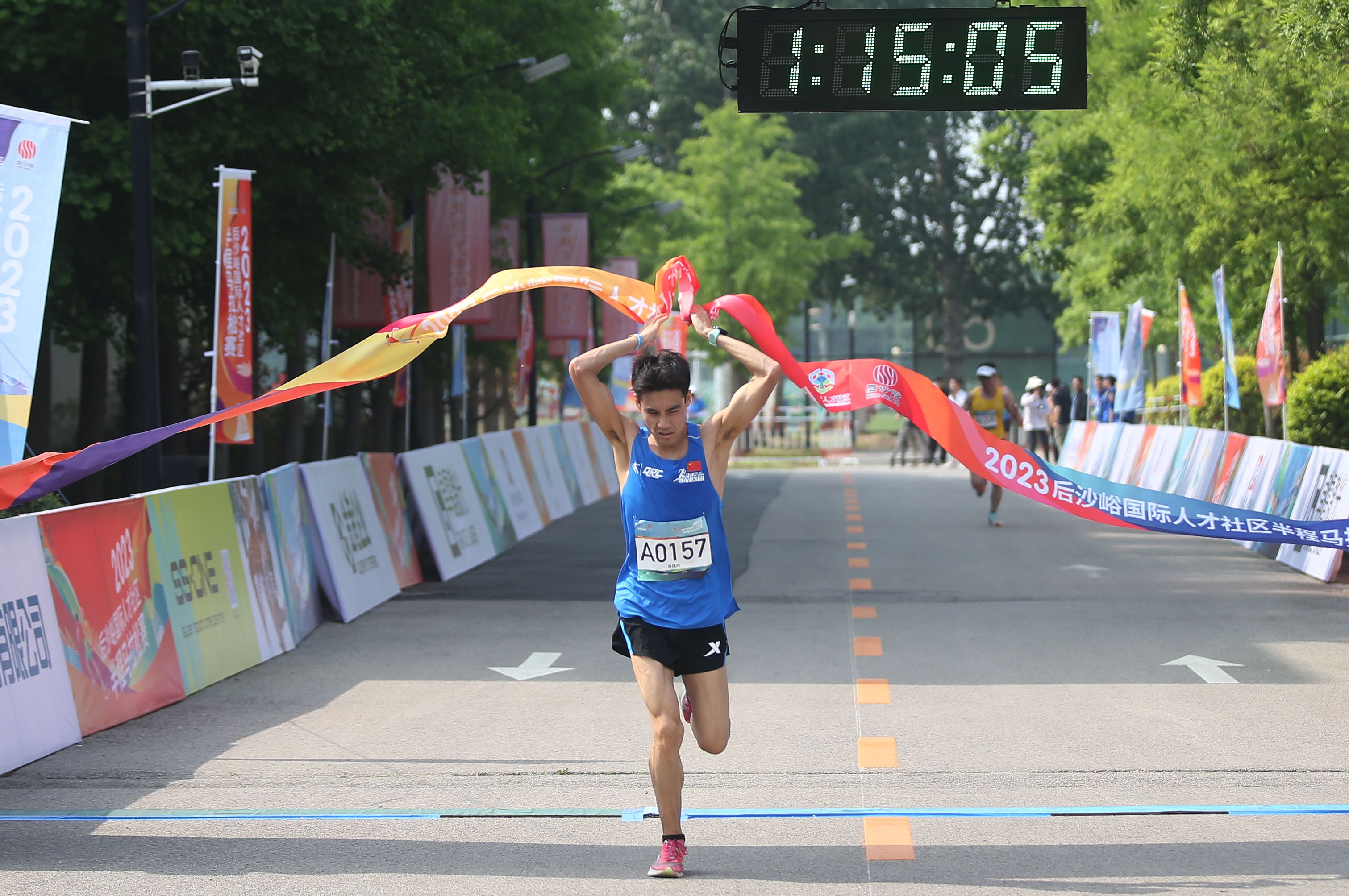 A0157号选手孙佳兴冲过终点,他以一小时十五分零六秒的成绩获得男子组冠军。新京报记者 李木易 摄