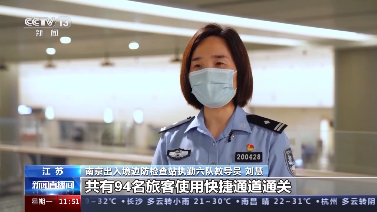 南京出入境边防检查站执勤六队教导员 刘慧:共有94名旅客使用快捷通道通关,勤务整体用时16分钟,通关效率较开启前大幅提升。