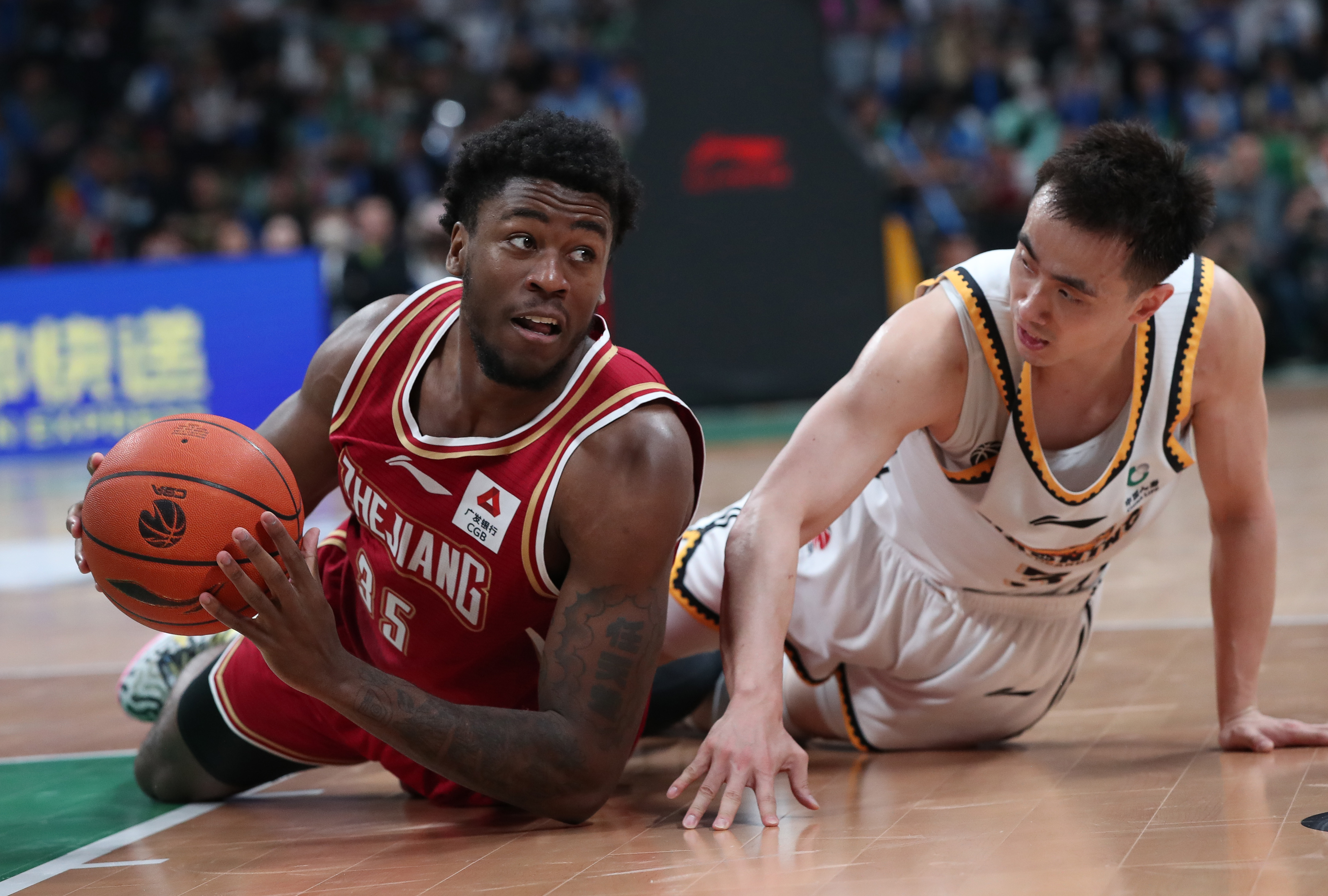 浙江队外援赖特(左)与赵继伟拼抢地板球。 图/新华社