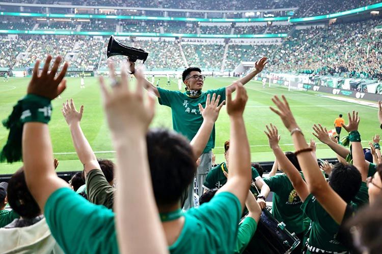 一位手拿扩音器的北京国安球迷带领其他球迷为主队加油。