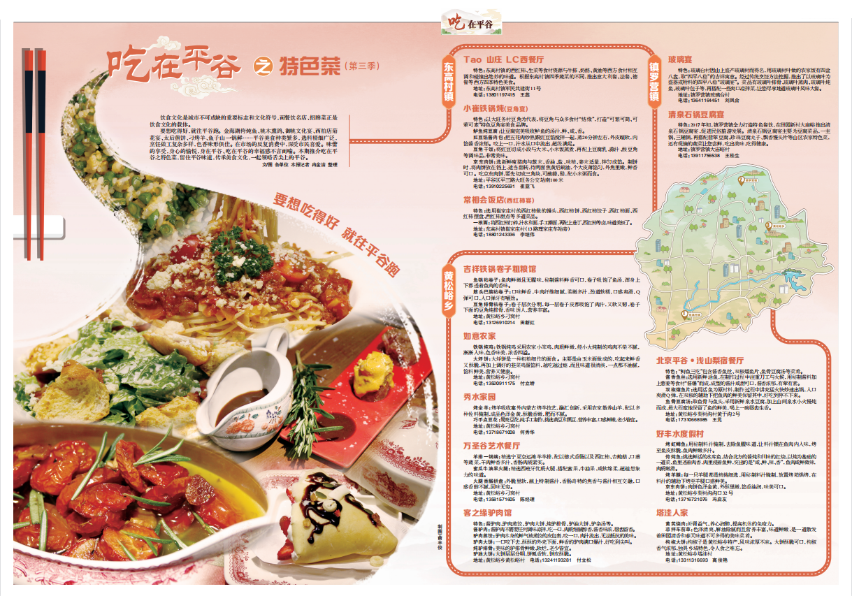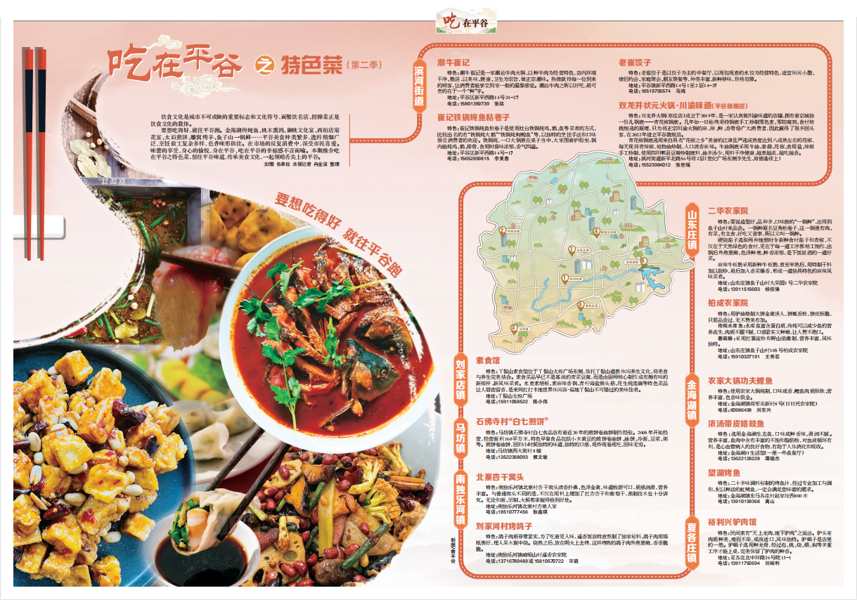 要想吃得好,就往平谷跑。金海湖侉炖鱼、桃木熏鸽、御桃文化宴、西柏店菊花宴、太后煎饼、刁窝烤羊、鱼子山一锅鲜……平谷美食种类繁多,选料精细广泛,烹饪做工复杂多样,色香味形俱佳。在市场的反复消费中,深受市民喜爱。味蕾的享受,身心的愉悦,身在平谷、吃在平谷的幸福感不言而喻。留住平谷味道,传承美食文化,一起领略舌尖上的平谷。