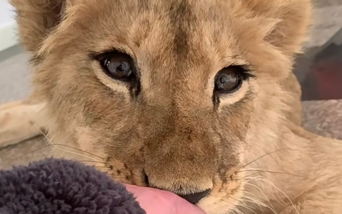 饲养者和幼狮互动。网传视频截图