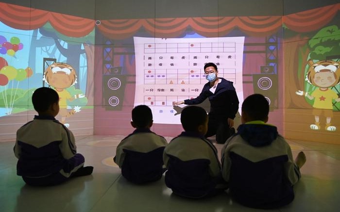 ▲在天津市北辰区特教学校的“音乐魔方”教室内,患有自闭症的学生在上课。图/新华社