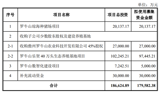 预案显示,本次向特定对象发行股票募集资金总额不超过179582.38万元,在扣除发行费用后,拟用于罗牛山琼海种猪场项目、收购子公司少数股东股权及建设养殖基地、收购儋州罗牛山农业科技开发有限公司45%股权、罗牛山乐贺40万头生态养殖基地项目、罗牛山数智化建设项目和补充流动资金。