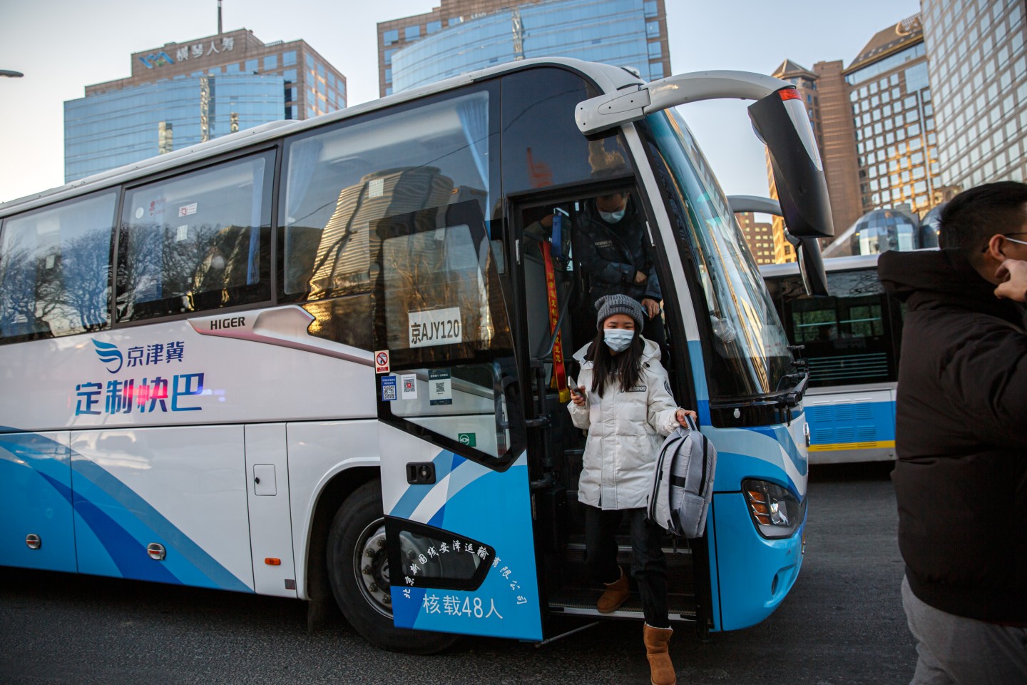 2023年1月31日,京津冀定制快巴燕京航城至国贸线路率先开通试运营。图为京津冀定制快巴抵达北京国贸地铁站G出口,乘客有序下车。郑新洽 摄