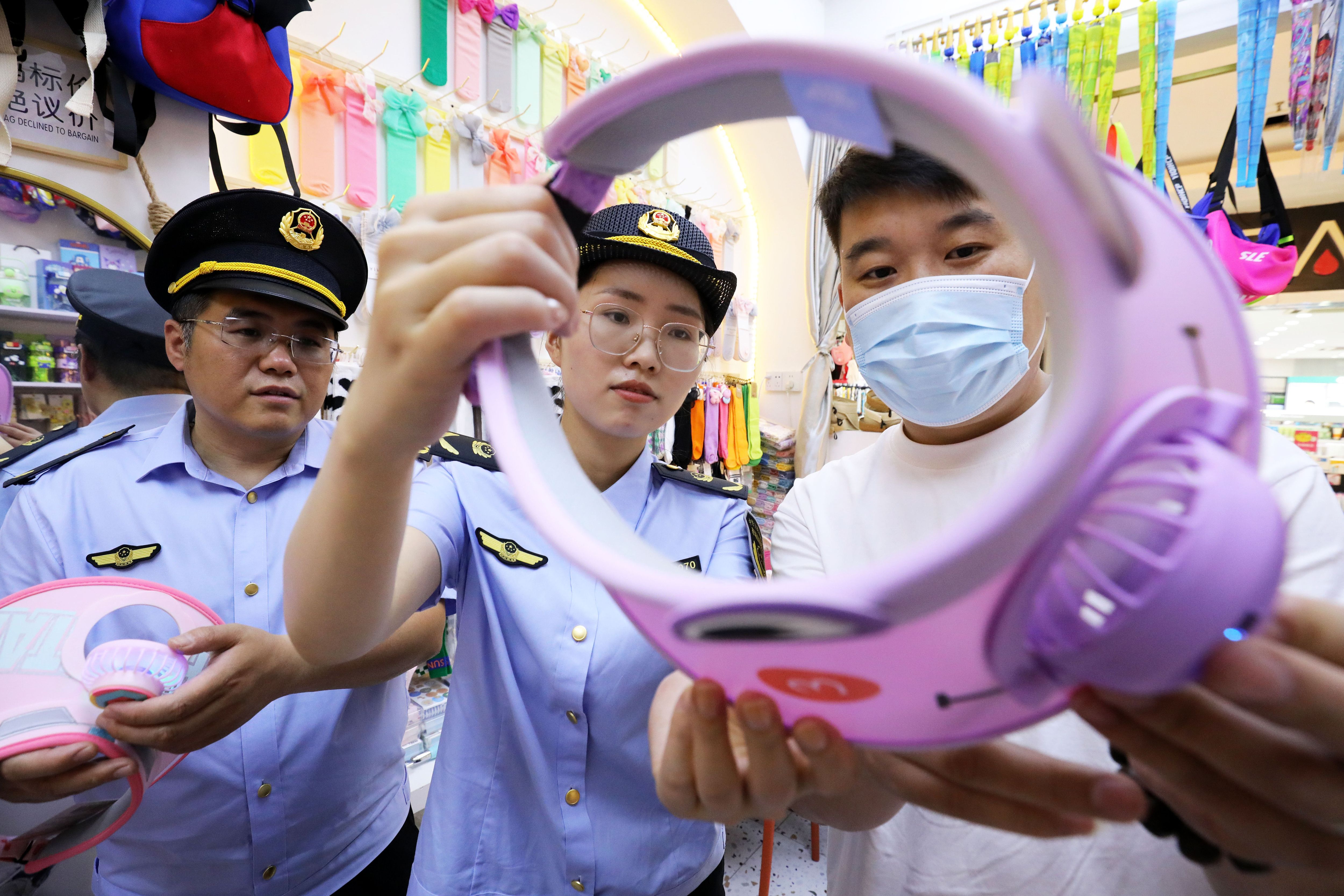 5月27日,安徽淮北,“六一”儿童节临近,市场监管执法人员对辖区儿童玩具和用品店进行检查。图/视觉中国