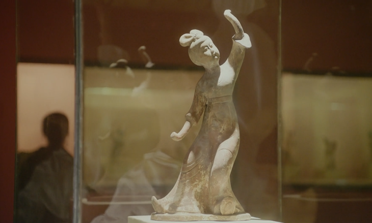 唐代乐女立俑在市面上难以找到高仿品,为了能高度还原这件艺术品,我们实地考察了博物馆真品,拍摄了大量的素材,又去邀请陕西制作陶俑艺术品的老师下场参与,经过一个多月的修改,上釉,做旧,最后还原了这件艺术品。它跟原件比并不完美,但是足以保证我们的全景中景拍摄。最后的特写拍摄结合了我们的特效部门的精心调节,达到了以假乱真的地步。