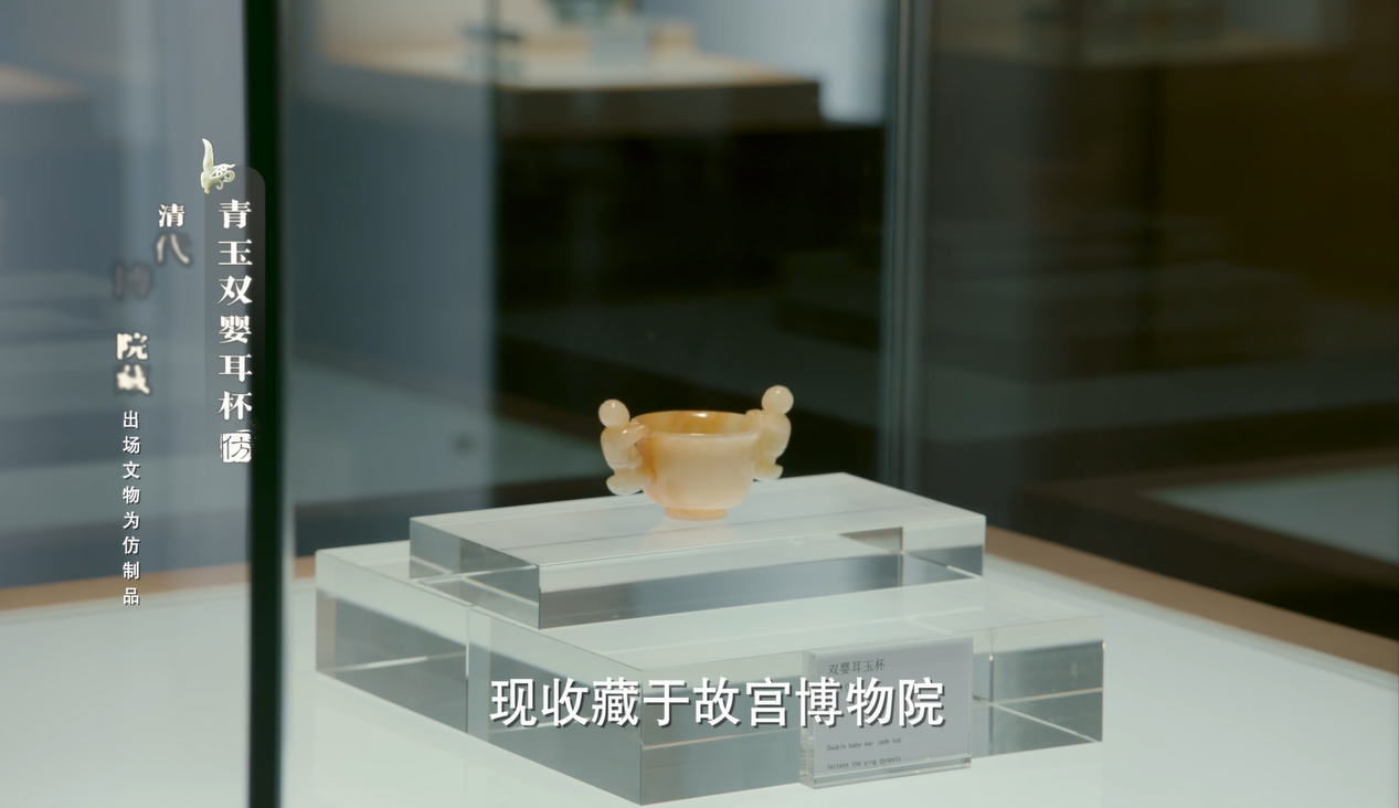双婴耳玉杯,玉料原为青色,有人为的紫红色沁痕。仿古玉雕艺术品的难点在于其本身特殊的质感和打磨的手艺,为了制作双婴耳玉杯,道具部门购买了一块与其相似程度较高的玉料,我们也是去博物馆参观了原作品,同时寻找了大量的物料参考,和一位资深的玉雕师傅合作,制作了这件艺术品。