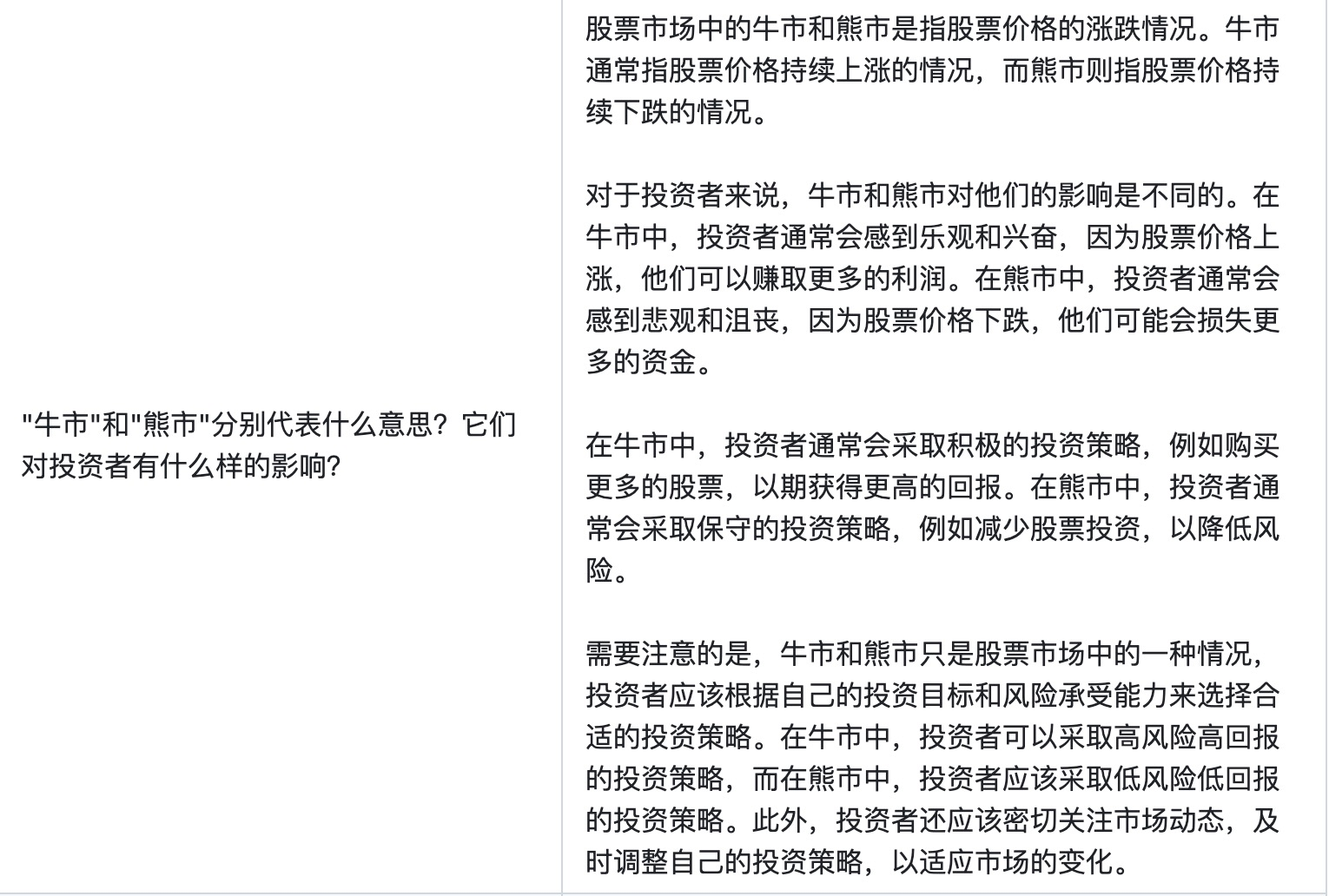 从「轩辕」的回答来看,其对于金融名词、概念的阐释比较专业和全面,并且给出了自己的建议和判断,例如,我在问到牛熊市对投资人的影响时,它除了解释牛熊市外,还分别提到了相应的投资策略。