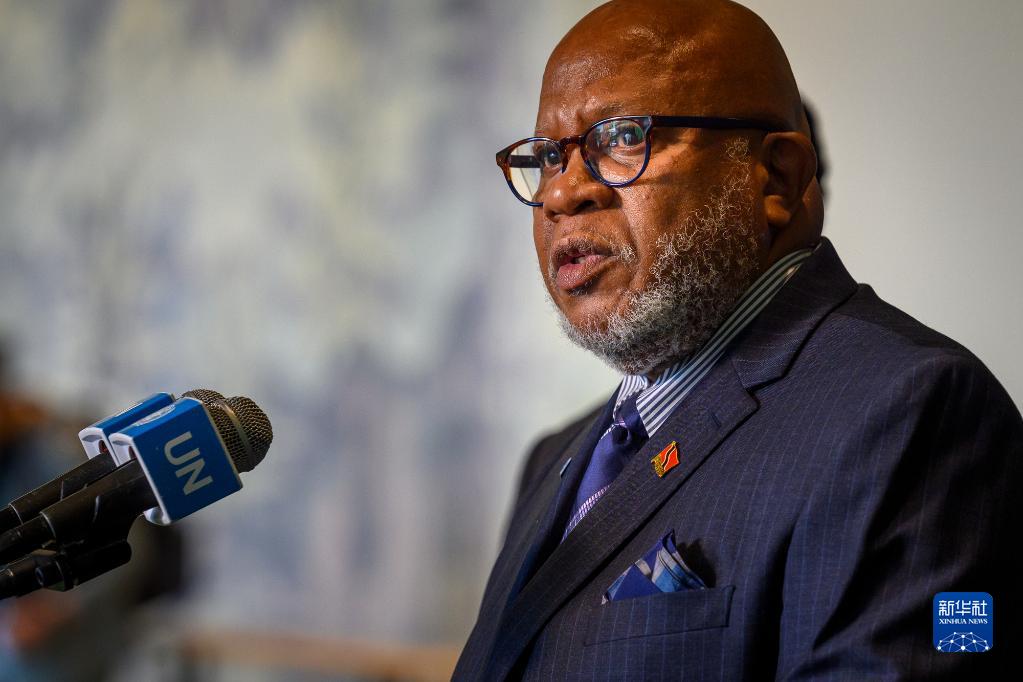 6月1日,在位于纽约的联合国总部,特立尼达和多巴哥常驻联合国代表丹尼斯·弗朗西斯当选第78届联合国大会主席后向记者发表谈话。新华社发(联合国供图/洛伊·费利普摄)