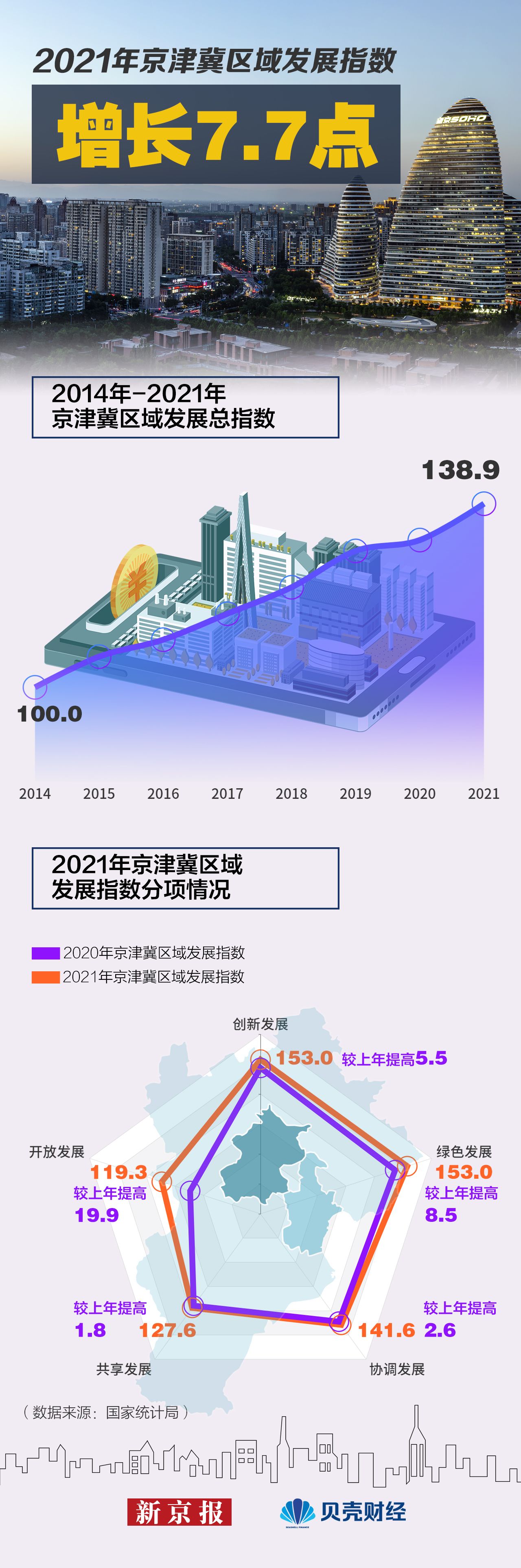 过去九年京津冀区域发展不断向好,产业协同效能显现。国家统计局数据显示, 2021年区域发展指数为138.9,相较上年增长7.7点。其中创新发展、绿色发展和协调发展成为京津冀地区发展主要支撑力量,相比上年分别增长5.5点、8.5点和2.6点。