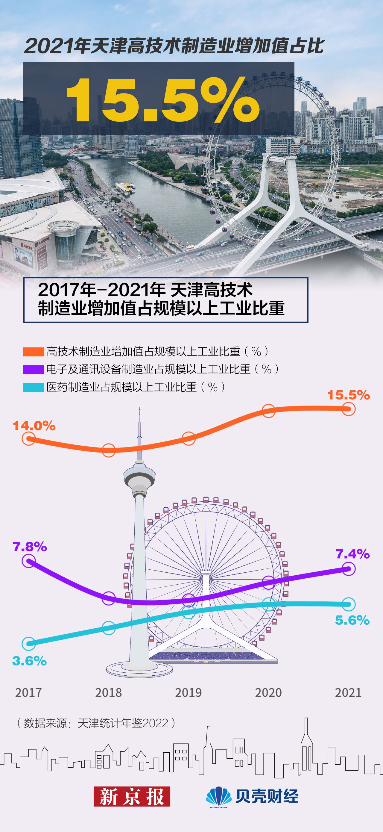 2019年至2021年,天津高技术制造业增加值占规模以上工业比重持续上升,电子及通讯设备制造业比重最大。2022年天津高技术制造业增加值增长3.2%,比重下滑至14.2%。值得注意的是,天津医药制造业比重持续上升,从2017年的3.6%增至2021年的5.6%;与电子及通讯设备制造业的差距缩小至1.8个百分点。2022年,天津医药制造业增长8.8%,快于天津规模以上工业9.8个百分点。