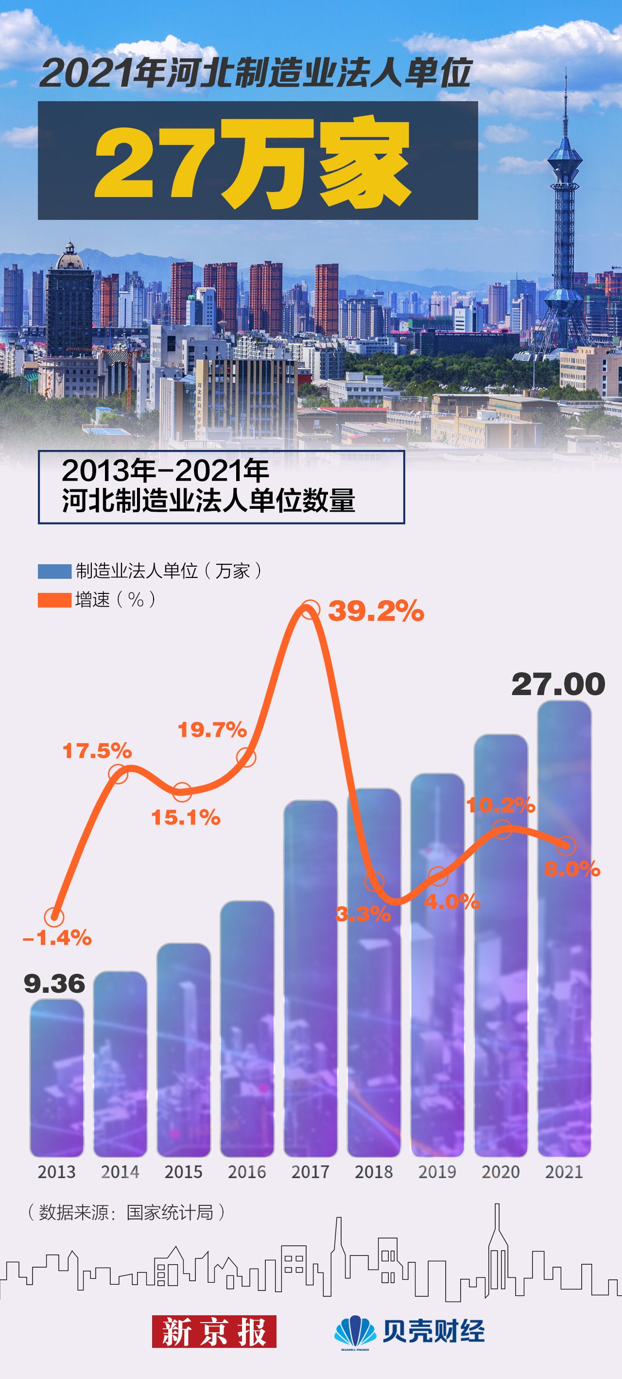 据工信部数据,河北制造业单位数区域比由协同前的54.6%提至2021年的79.3%。2014年至2017年,河北制造业法人单位增速保持在两位数,2017年,河北制造业法人单位数量突破20万家。到2021年底,河北制造业法人单位数量达27万家,相比上年增长8%。