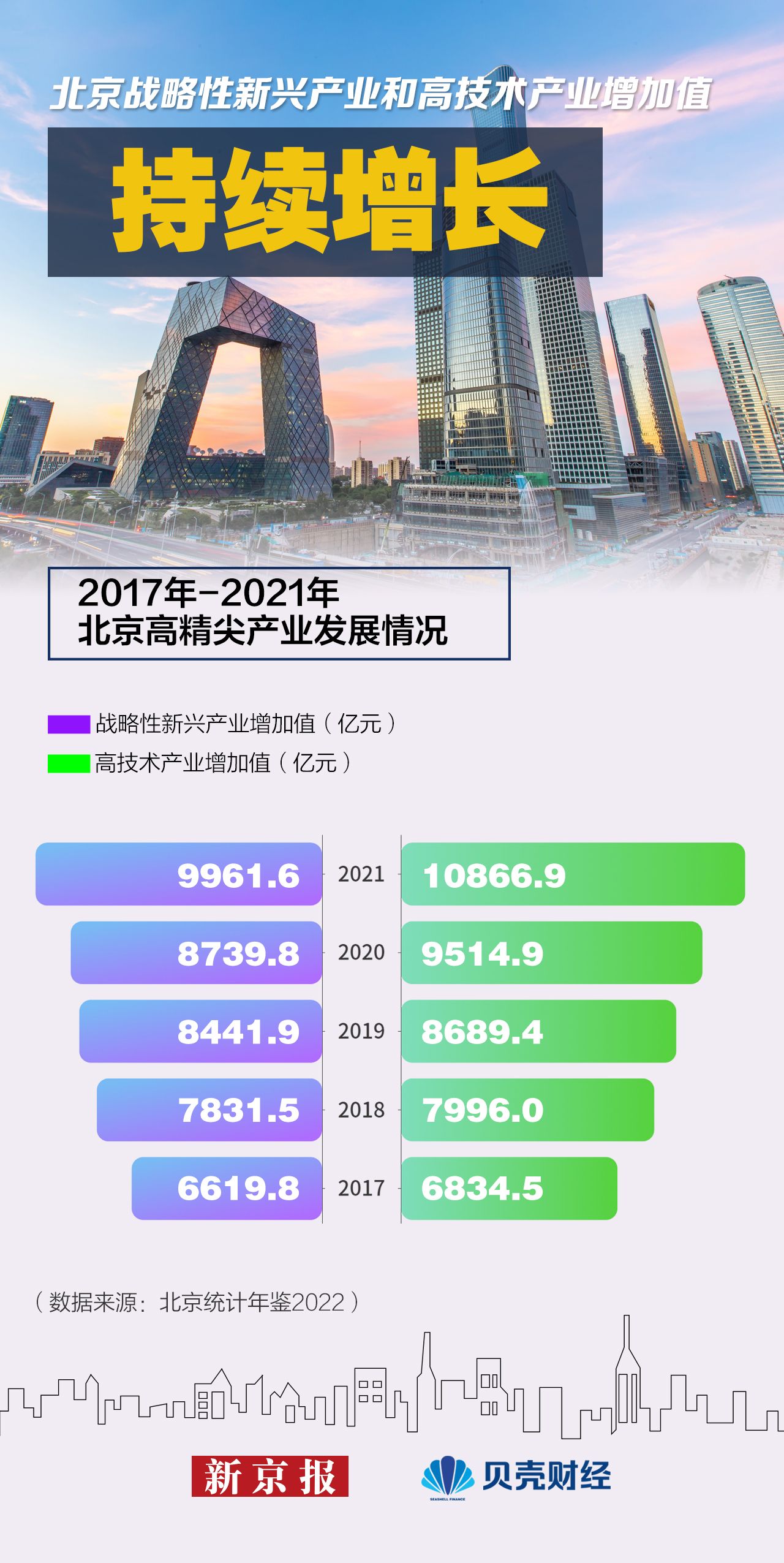 发展高精尖产业,成为北京构建科技创新链条的重要环节。目前,北京高精尖产业崭露头角,2021年高技术产业增加值突破万亿元,占GDP总量的26.99%;战略性新兴产业增加值从2017年的6619.8亿元增至9961.6亿元。同时,北京以高精尖产业为牵引,打造并壮大发展新动能,辐射带动三地科技创新和成果转化,更好推动京津冀协同创新发展。