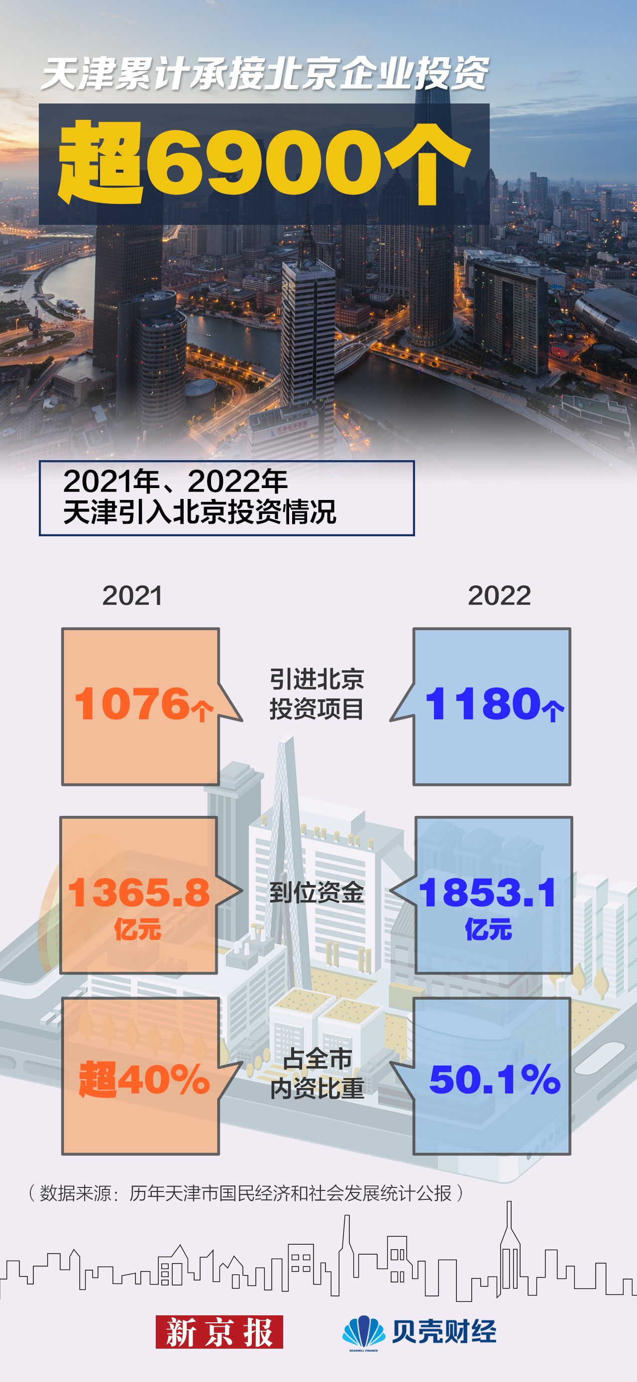 九年内,天津累计引进北京企业投资超6900个,到位资金超1.2万亿元。2022年,天津引进北京投资项目1180个,到位资金相比去年增长35.7%,占天津吸纳内资比重的50.1%。