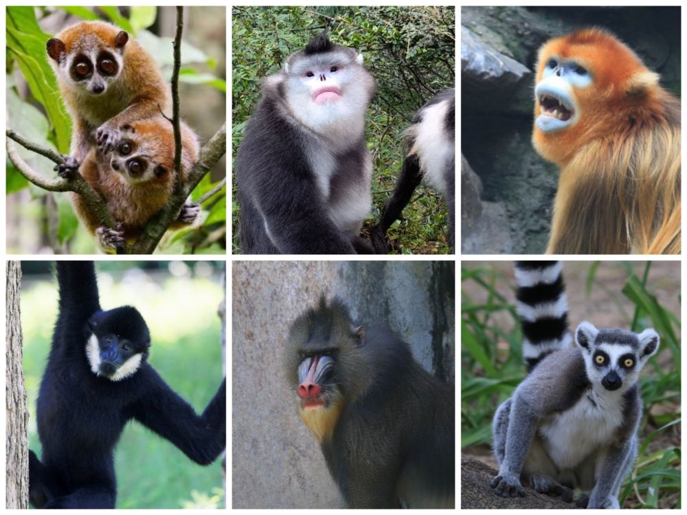 “灵长类基因组计划”第一期公布了基因组数据的部分灵长类物种:(从上到下,从左至右)蜂猴、滇金丝猴、川金丝猴、白颊长臂猿、山魈、环尾狐猴。(中国科学院昆明动物研究所马晓锋供图)