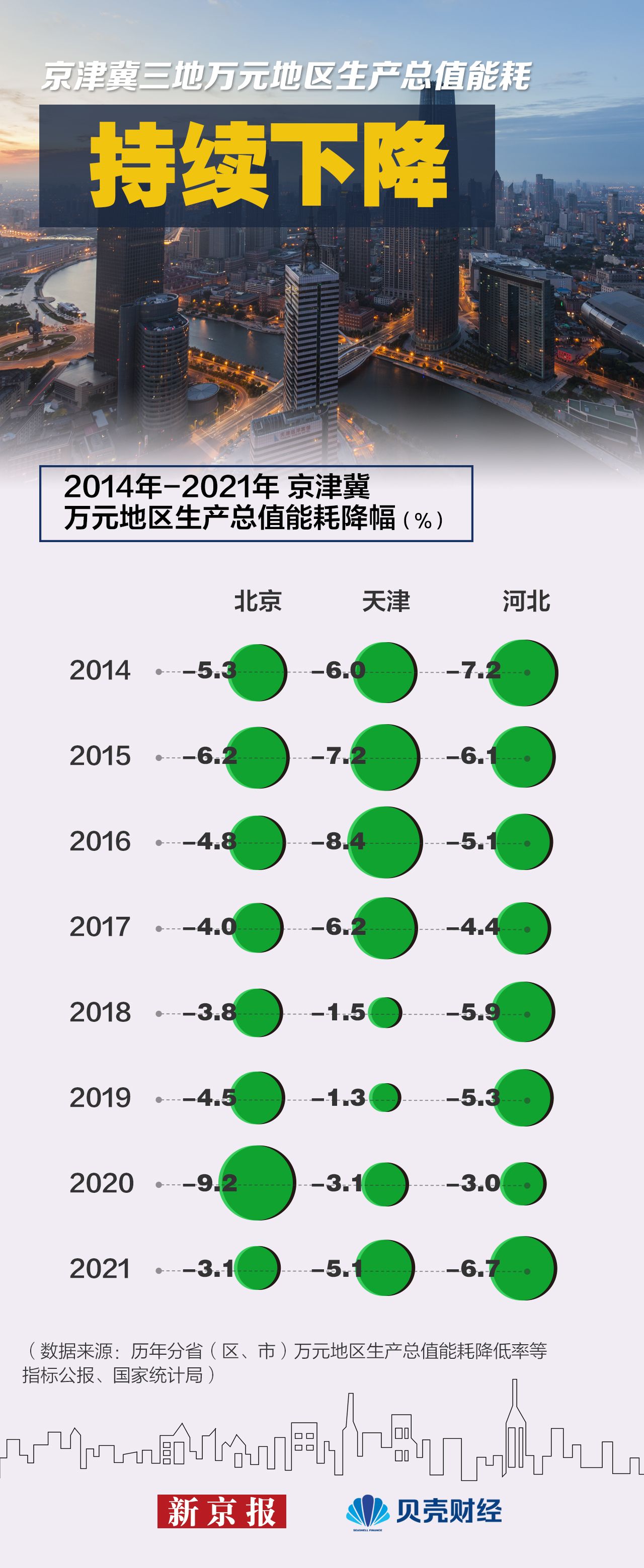 2021年,京津冀三地万元地区生产总值能耗分别下降3.1%、5.1%和6.7%,其中河北降幅最大,北京能耗保持最低。