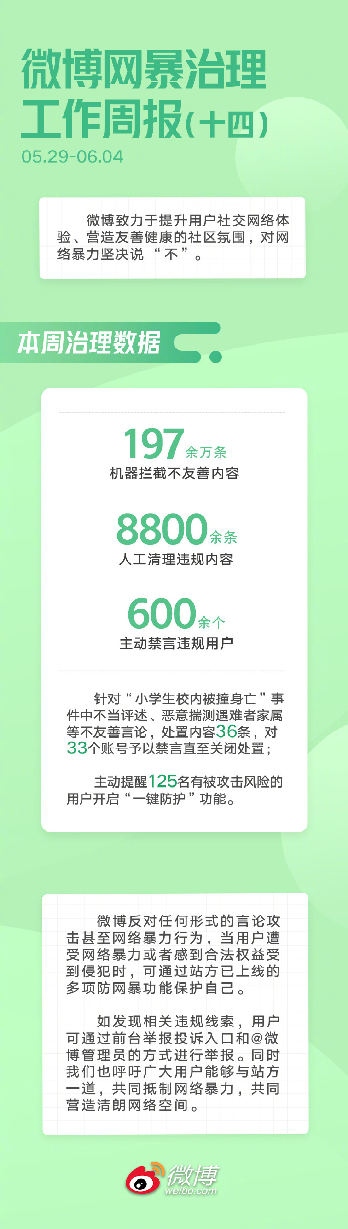 新京报讯 6月5日,微博管理员发布微博网暴治理工作周报。其中提到,针对“小学生校内被撞身亡”事件中不当评述、恶意揣测遇难者家属等不友善言论,处置内容36条,对33个账号予以禁言直至关闭处置。